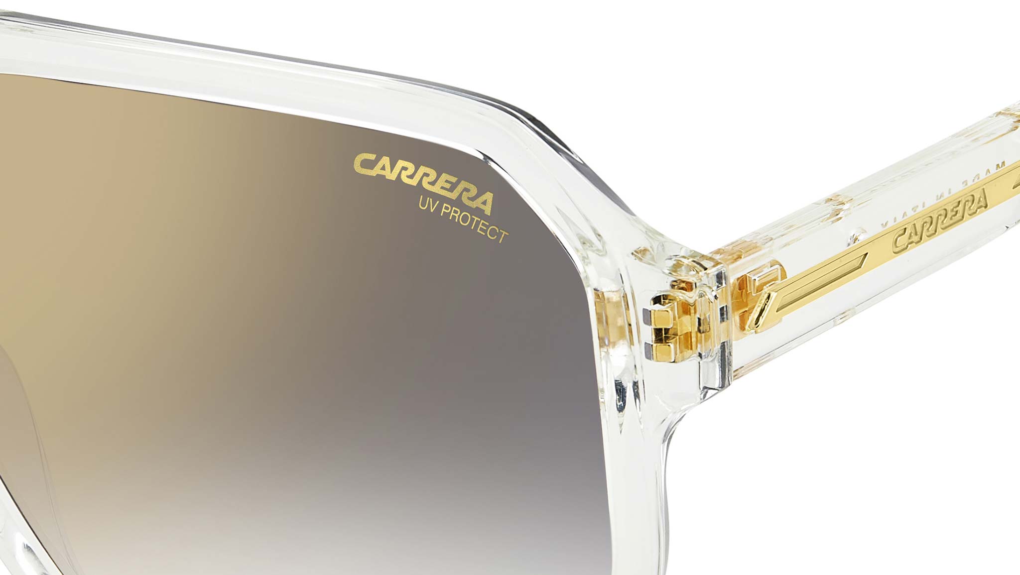 Carrera sunglasses model Victory C 01/S color code 900 FQ Crystal. Carrera continues to blaze a trail in eyewear: these Made-in-Italy iconic sunglasses are part of a dedicated festival capsule collection. Their absolute quality is sure to get noticed! The double bridge shape boasts the brand's 'C' detail and the Carrera flag placed horizontally to celebrate the Victory logo. Even the lenses, printed with 'Carrera Festival Edition', are pure Carrera style, expressed through the must-have iridescent coating.