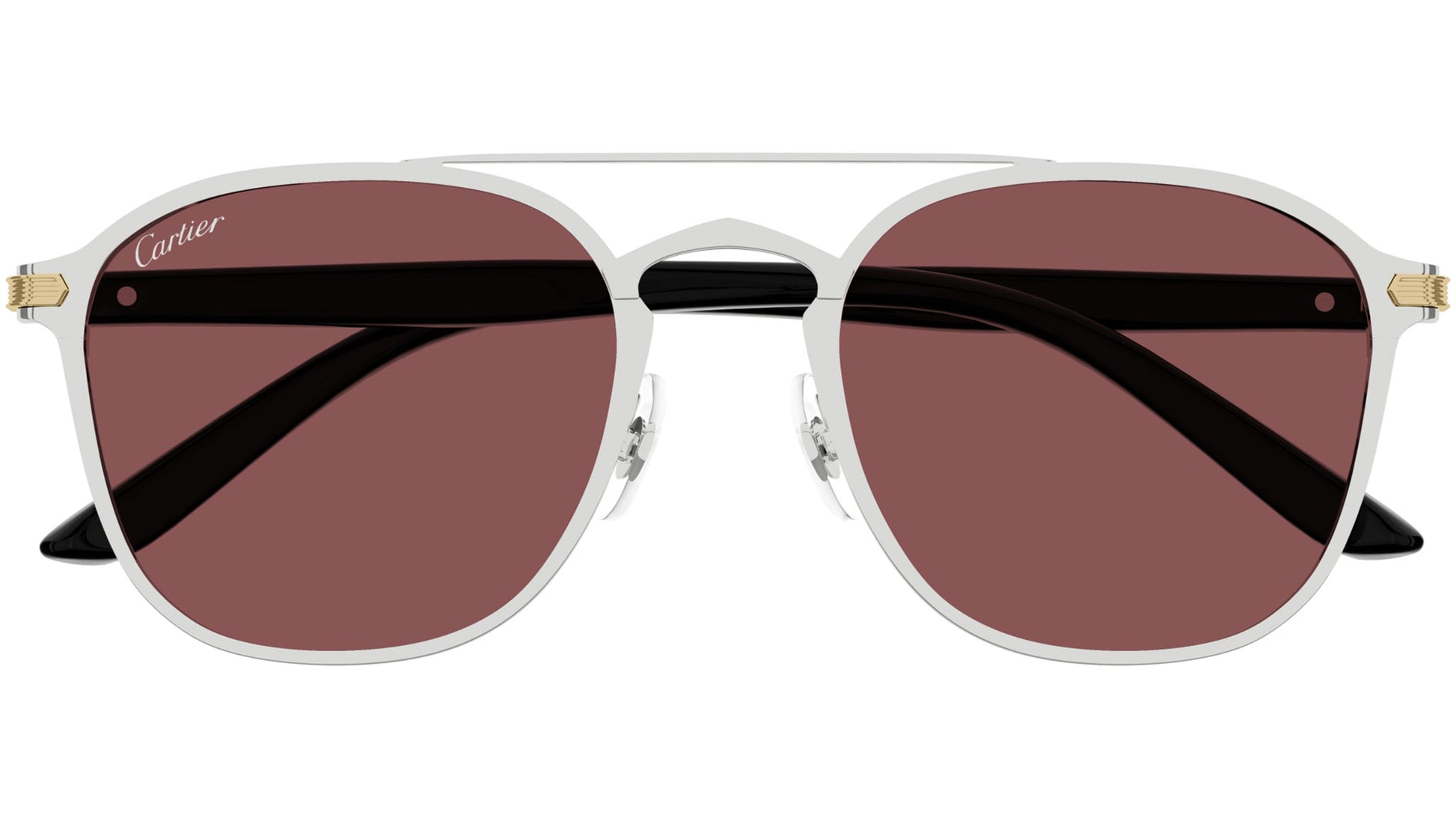 Cartier Contemporary sunglasses model CT0012S rectangle metal frame color code 007 smooth platinum finish with black temple and bordeaux lens.
