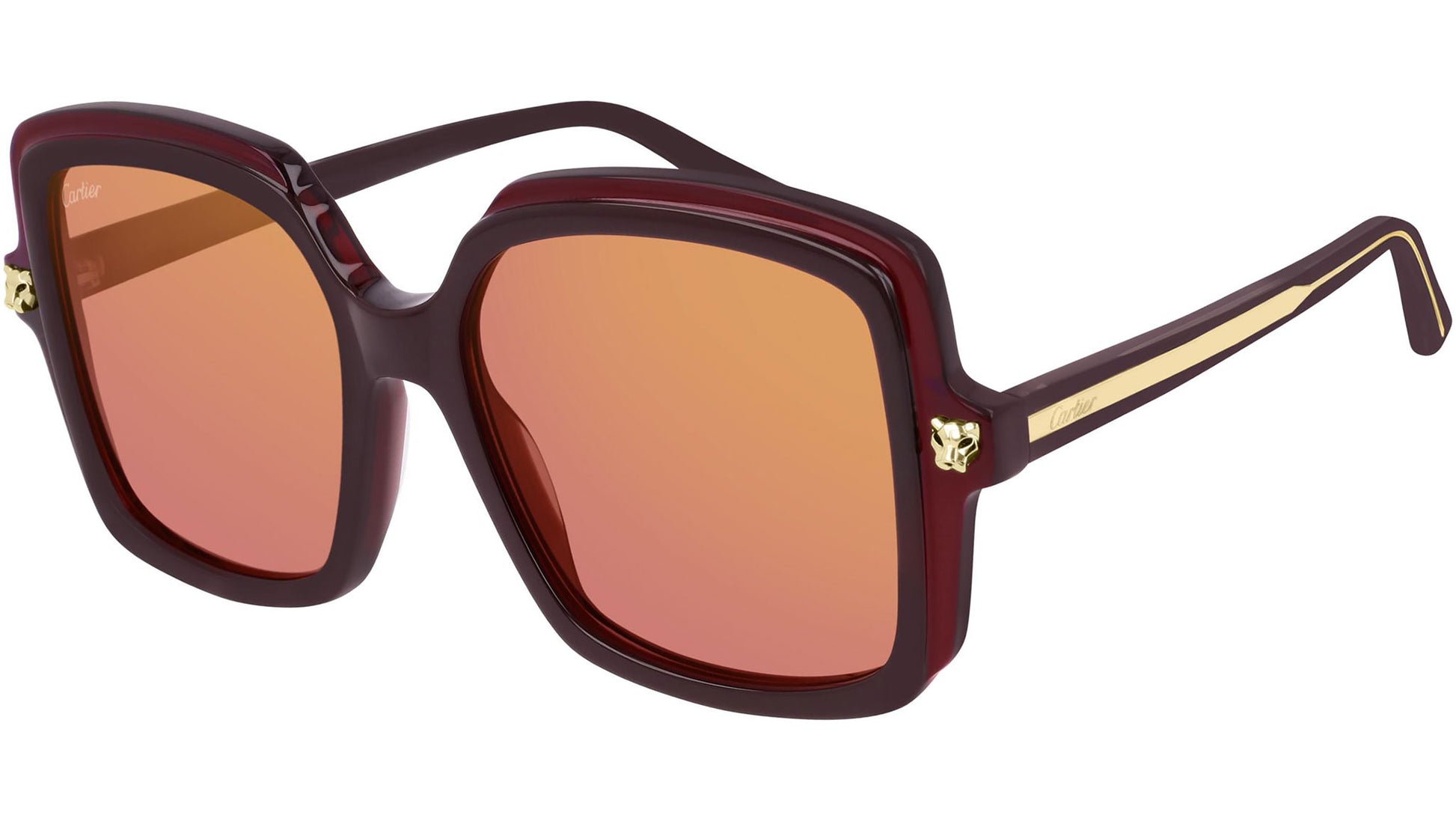 Cartier CT0196S 004 sunglasses with shiny bilayer solid dark burgundy / transparent burgundy frame and bordeaux with a golden flash lens.