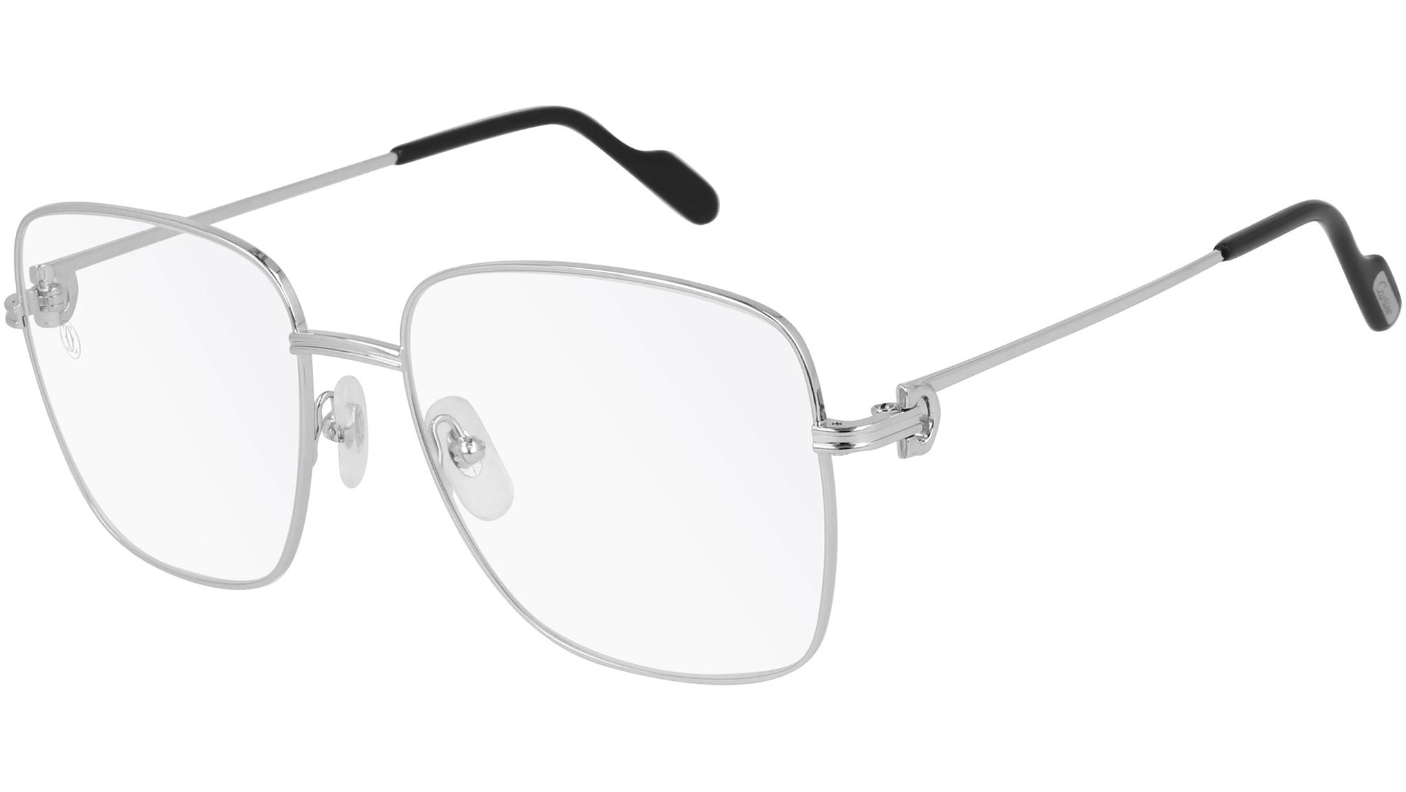 Cartier Core Range optical collection model CT0253O 001 featuring smooth platinum frame and silver temple.