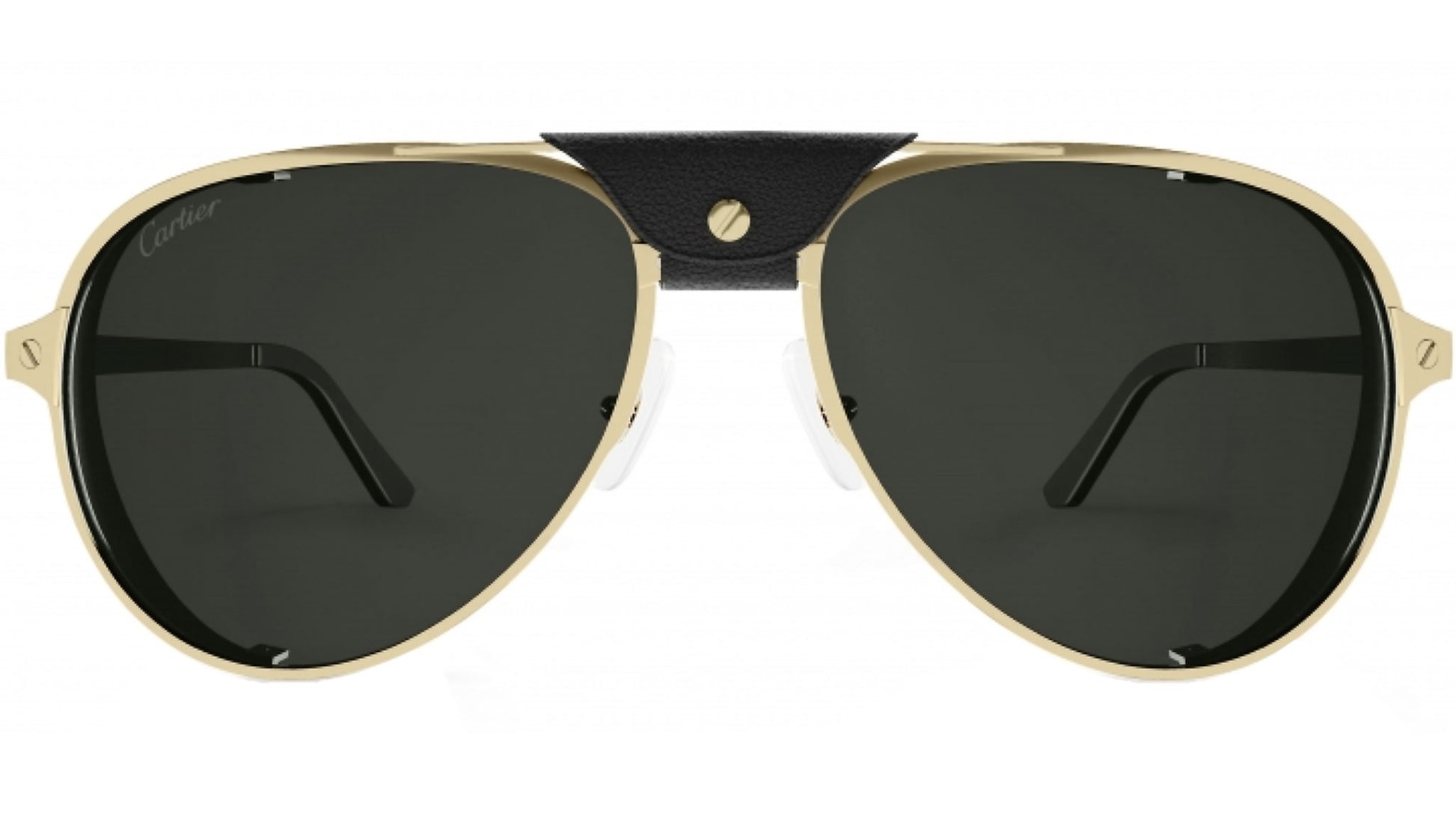 Cartier CT0296S 001 sunglasses with smooth and brushed golden finish frame and grey polarized lens.