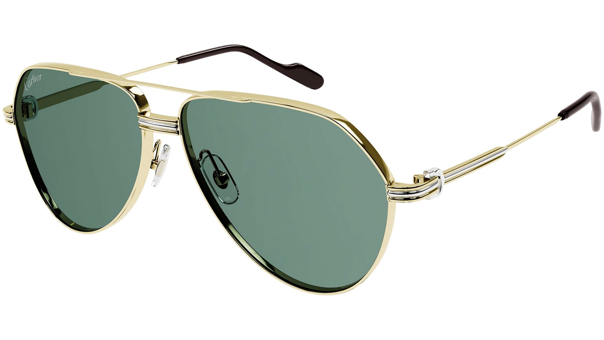 Cartier CT0303S 004 sunglasses with smooth golden finish frame and green lens.