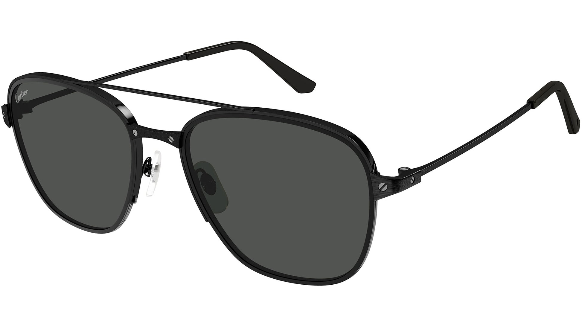 Cartier Core Range sunglasses collection model CT0326S 005 featuring smooth and brushed black PVD finish frame and black lens.
