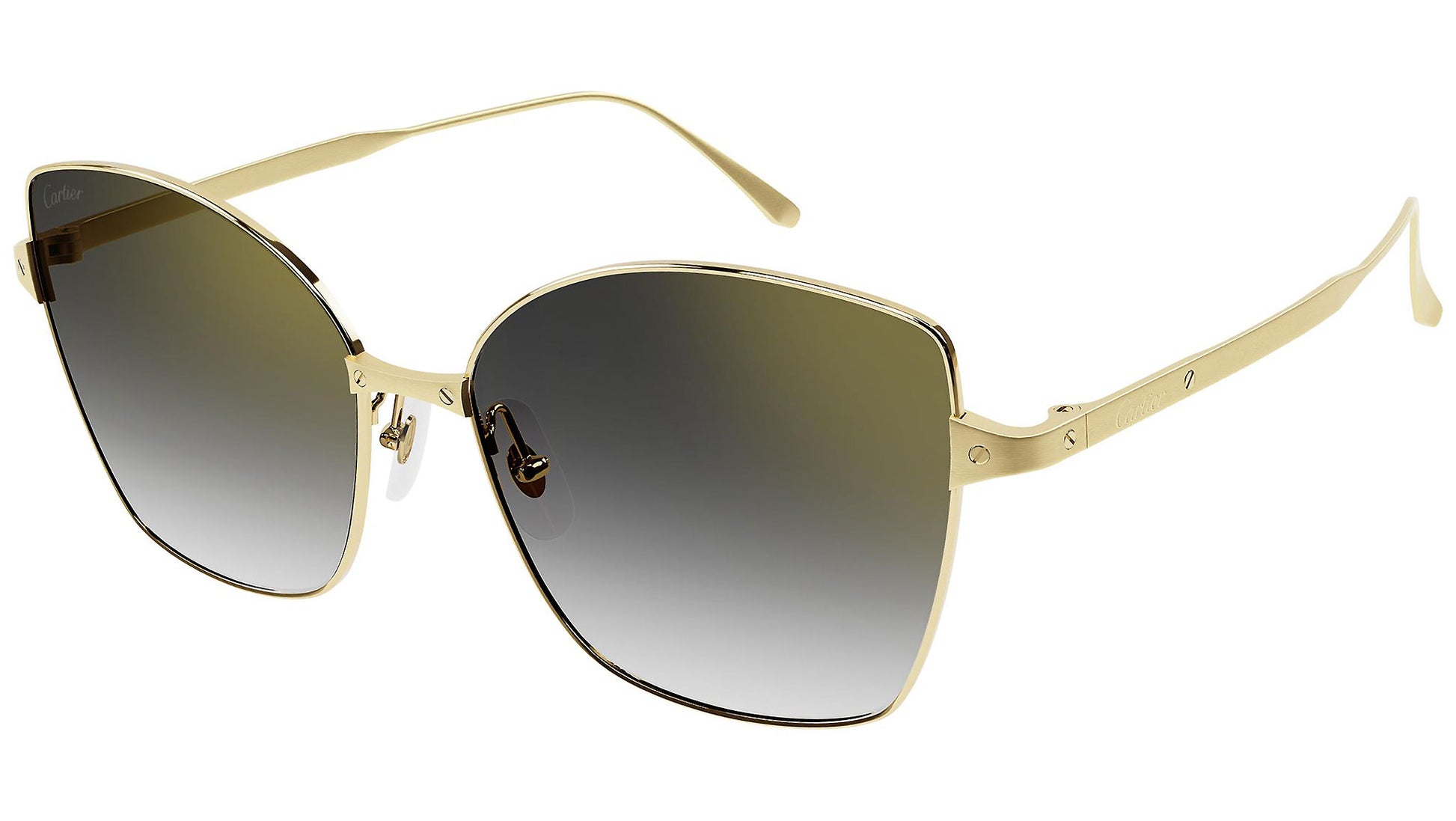 Cartier 0328S 001 sunglasses with smooth and brushed golden finish frame and graded grey with a golden flash lens.