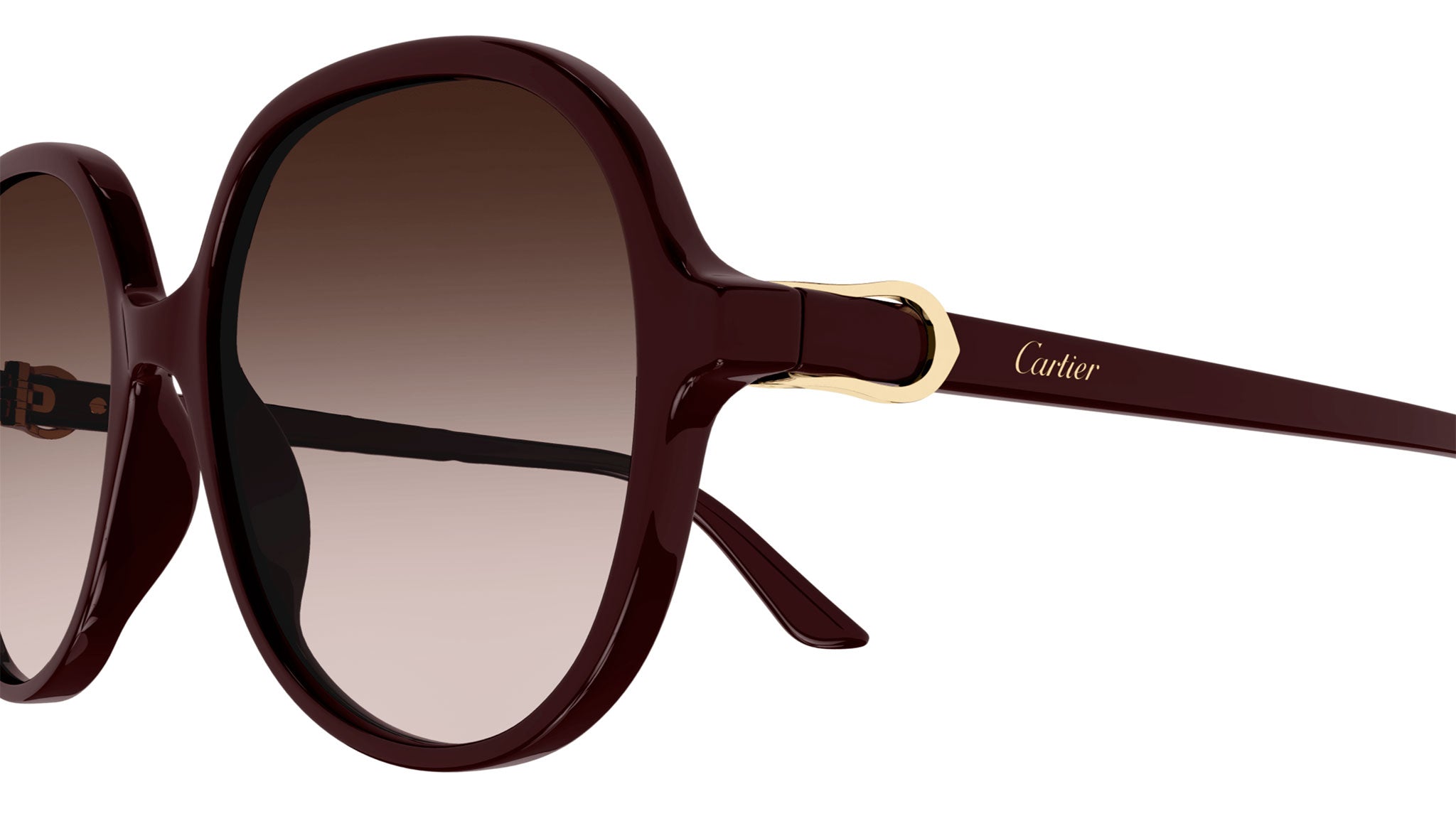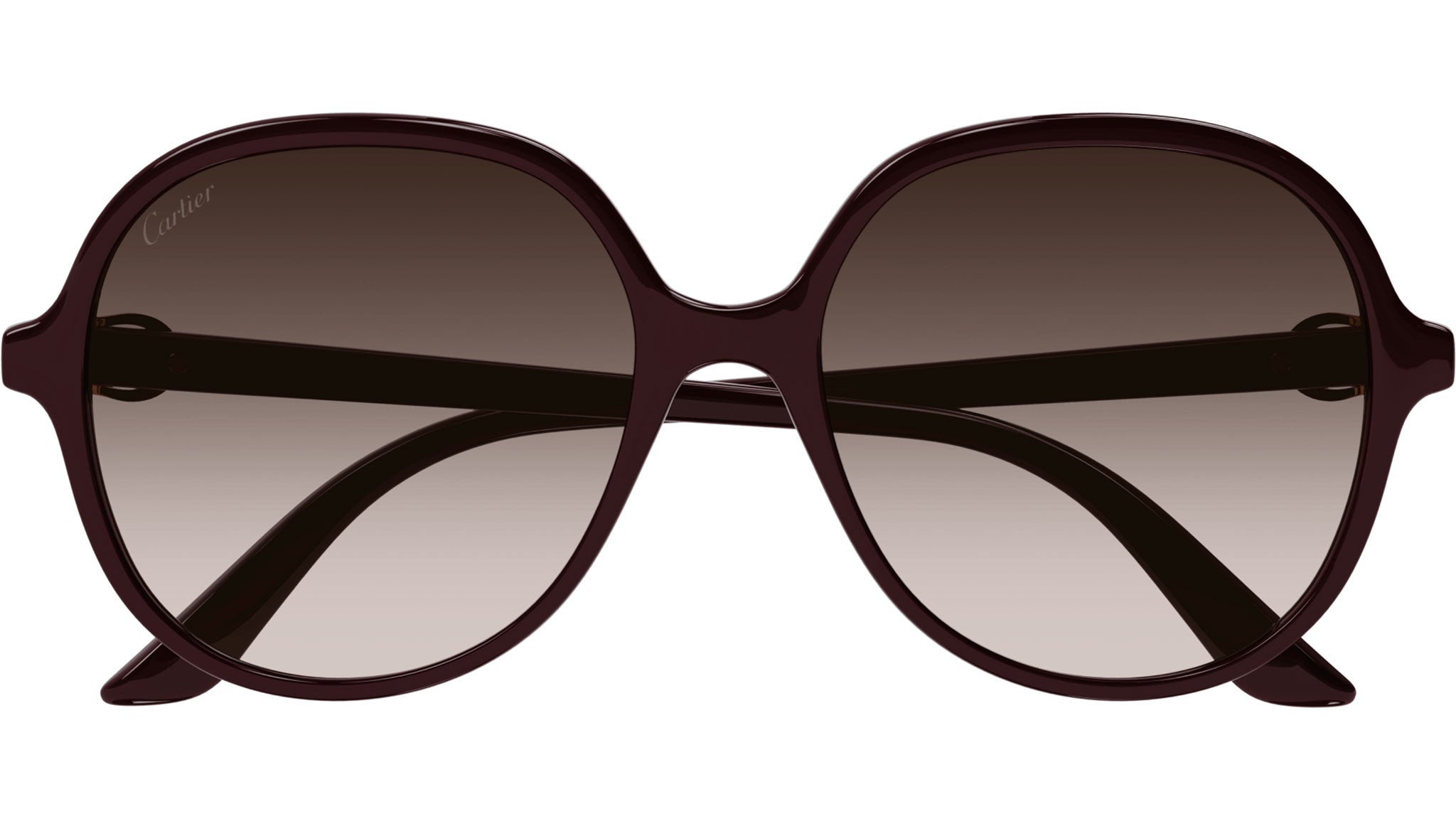 Cartier Initiation sunglasses collection model CT0350S 003 featuring bordeaux frame and graded brown lens.