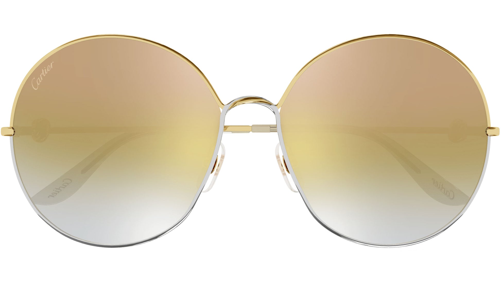 Cartier Core Range sunglasses collection model CT0360S 003 featuring smooth golden finish frame and grey with a rose gold / gold and silver mirror effect lens.
