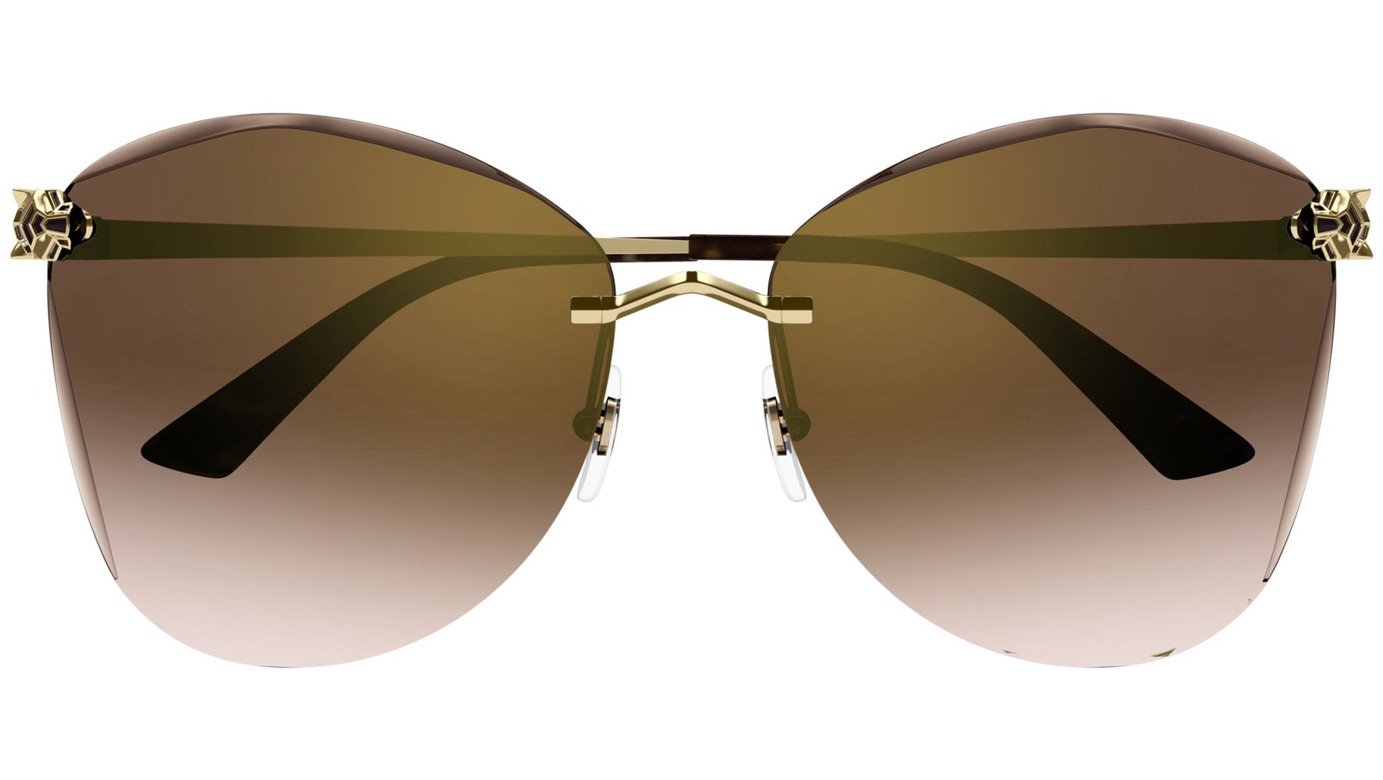 Cartier Core Range sunglasses collection model CT0398S 002 featuring smooth golden finish frame and graded brown with a golden flash lens.