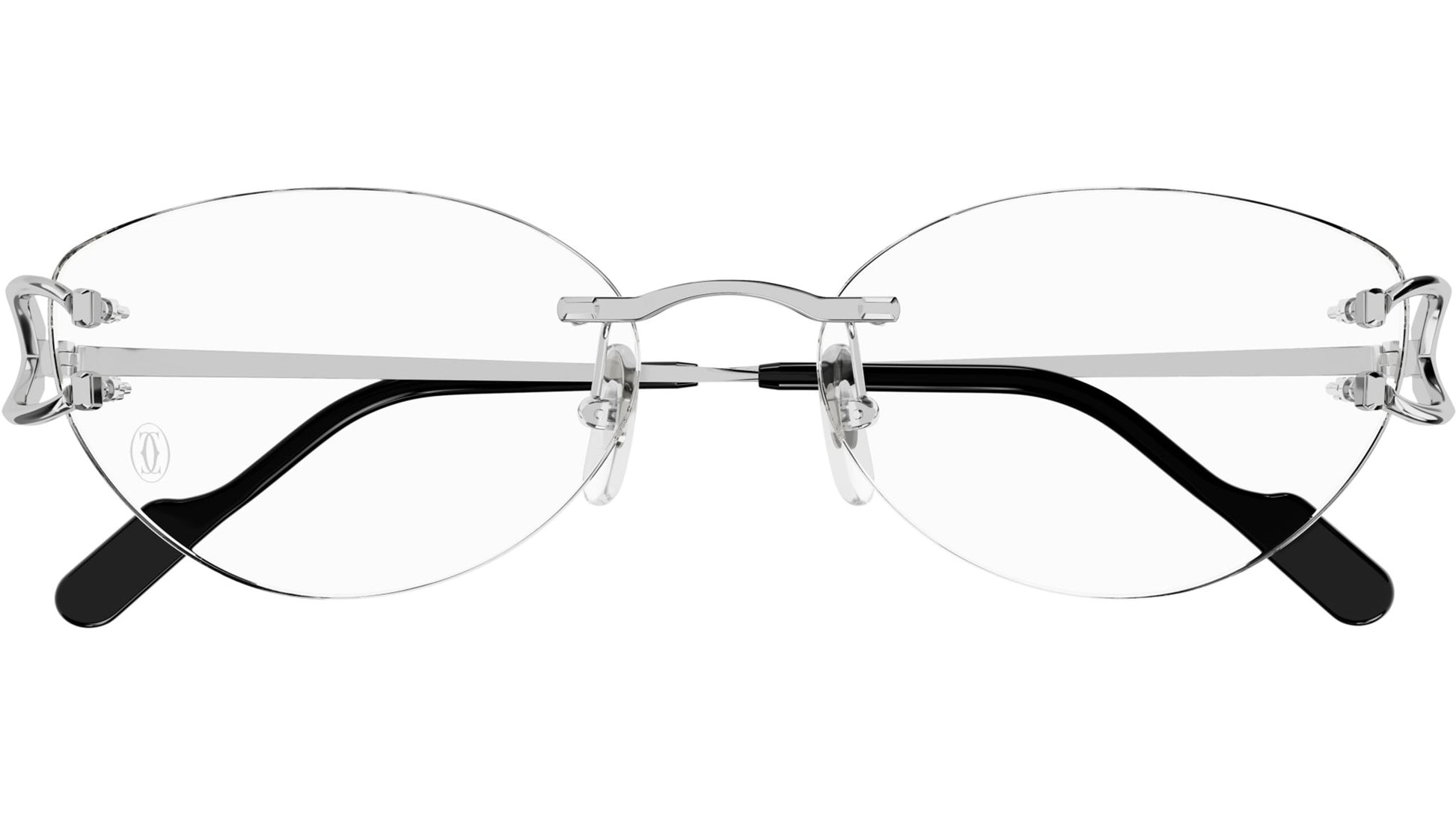 Cartier Core Range eyewear model CT0487O cat eye metal glasses color code 002 smooth platinum finish with silver temple and recycled demo lens with hard coating and AR blue out.