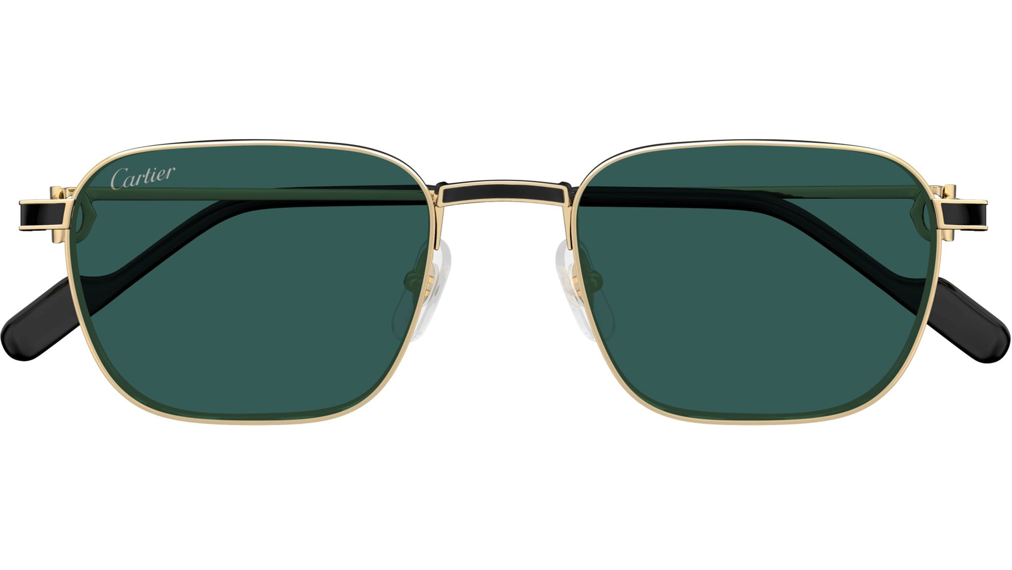 Cartier Exception sunglasses model CT0497S rectangle metal frame color code 008 smooth golden finish with gold temple and green lens.