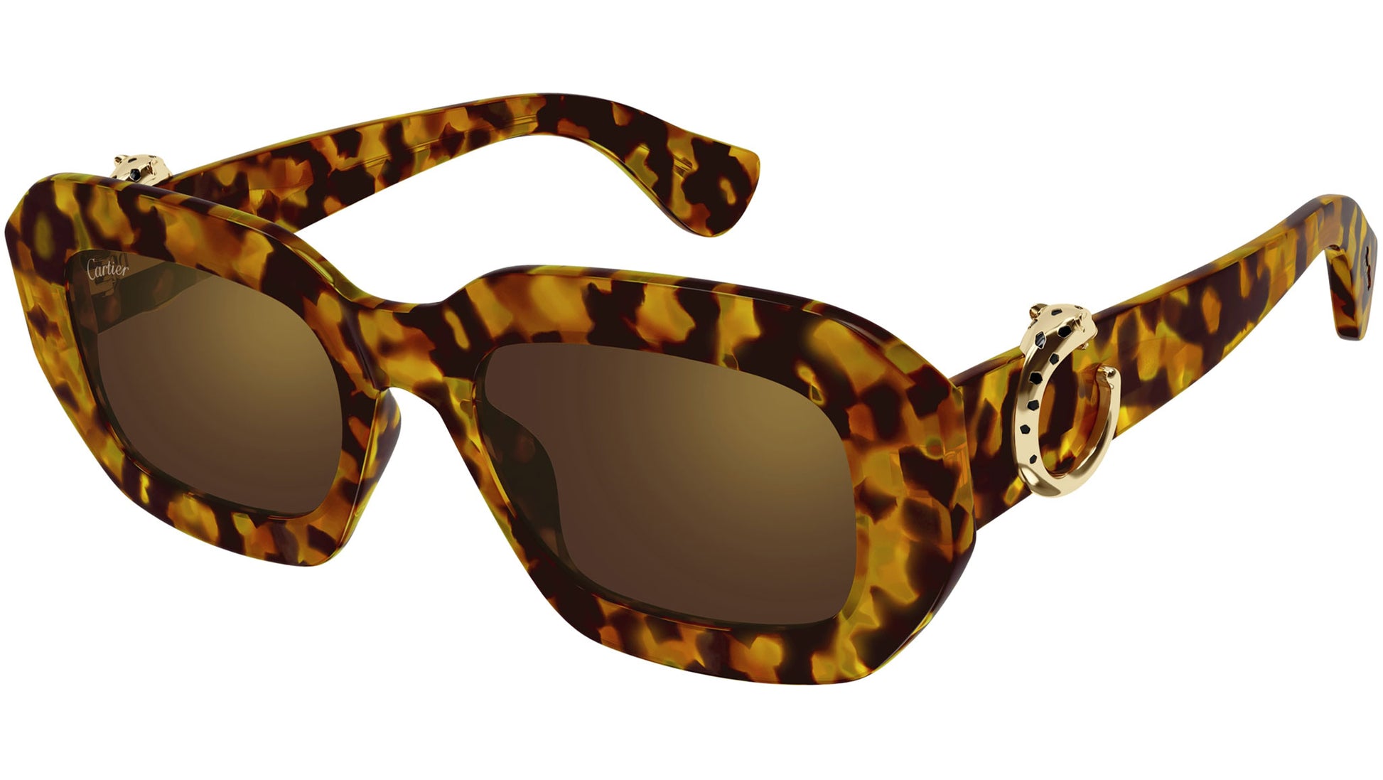 Cartier CT0546S 005 sunglasses for women, featuring spotted honey tortoiseshell effect rectangular recycled acetate frame and brown with a golden flash nylon lenses. Brand line: Core Range. Style code: CT0546S. Color code: 005. Made in Italy. Authorized Cartier online reseller. Your glasses will include the original case and accessories and are covered by a 12-month global warranty.