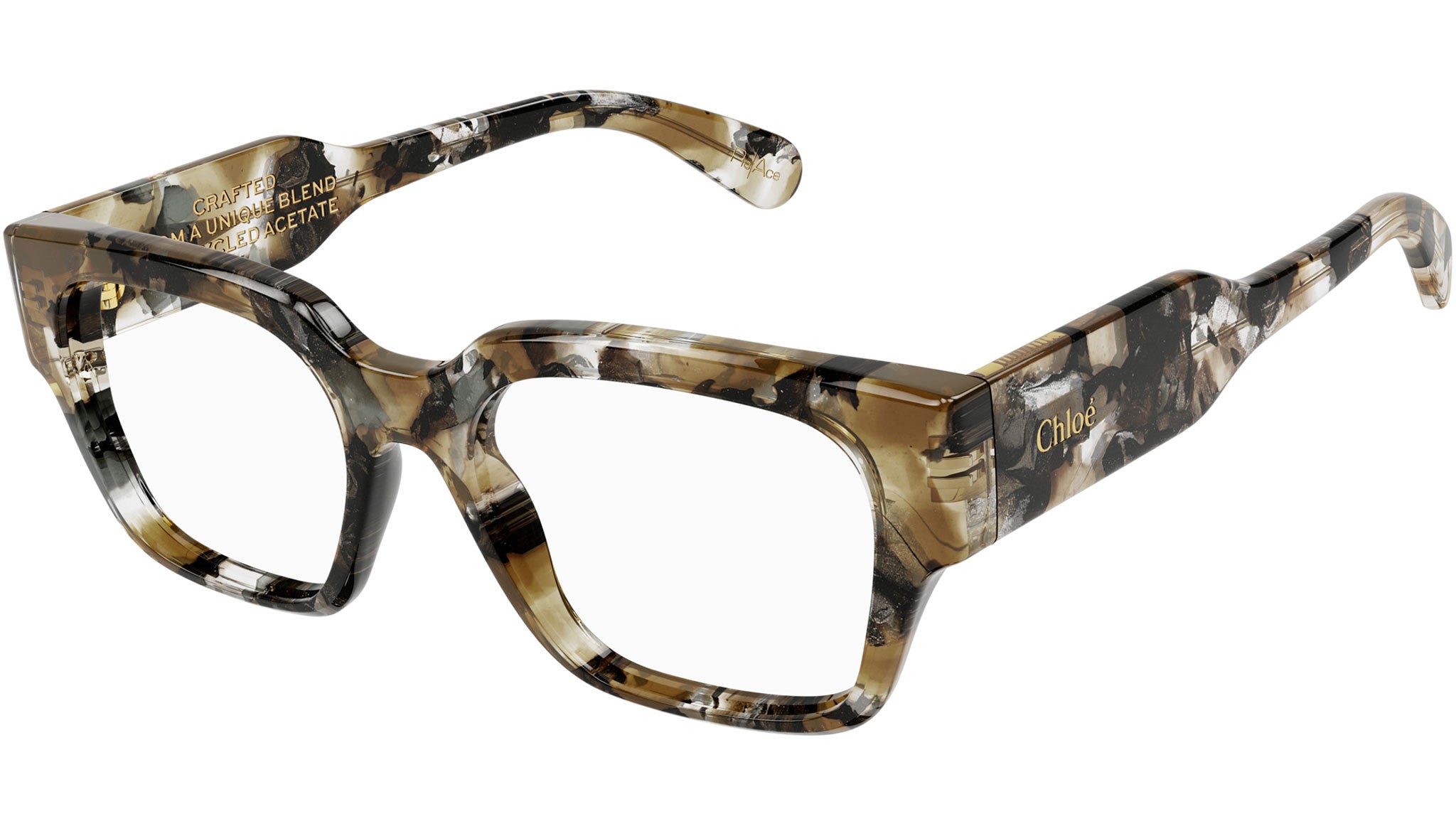 Chloé CH0150O 013 glasses for women, featuring military green rectangular recycled acetate frame and demo lenses. Brand line: Chloé. Style code: CH0150O. Color code: 013. Made in Italy. Authorized Chloé online reseller. Your glasses will include the original case and accessories and are covered by a 12-month global warranty.