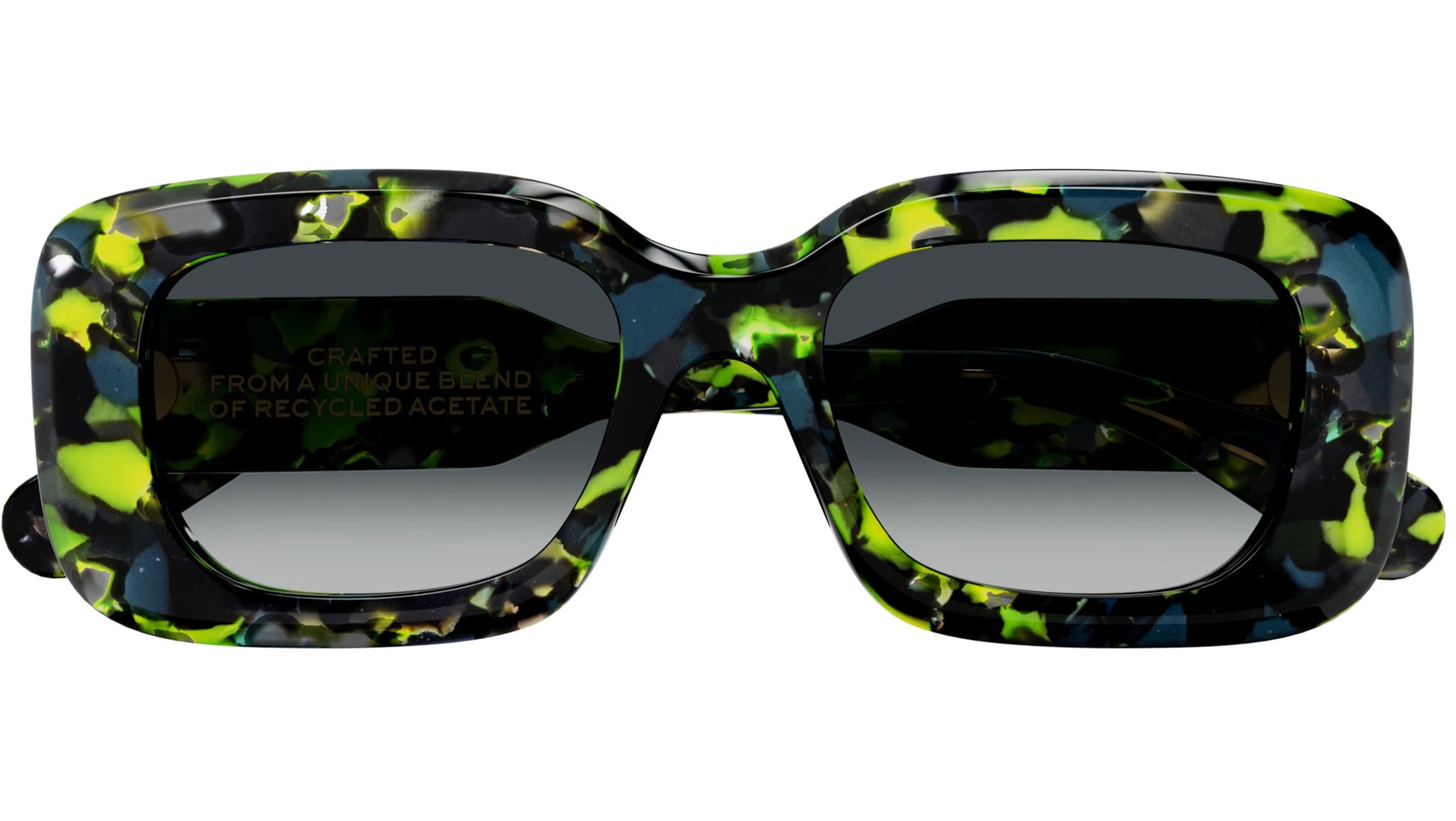 Chloé CH0188S 005 sunglasses for women, featuring neon green rectangular recycled acetate frame and gradient grey-green bio nylon lenses. Brand line: Chloé. Style code: CH0188S. Color code: 005. Made in Italy. Authorized Chloé online reseller. Your glasses will include the original case and accessories and are covered by a 12-month global warranty.
