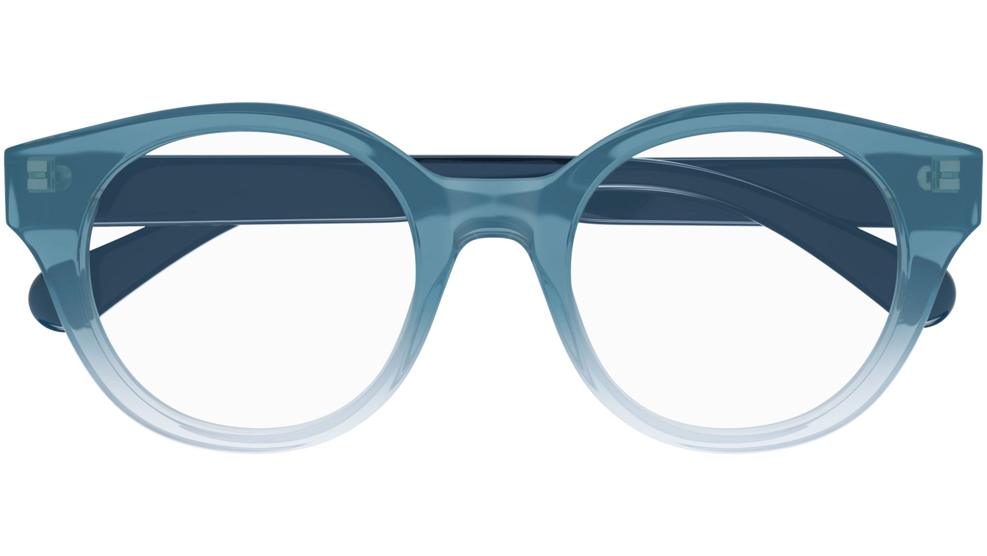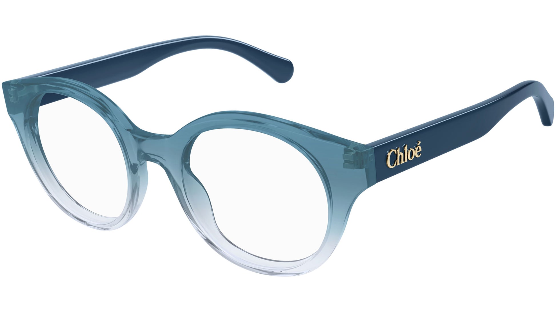Chloé CH0271O 009 glasses for women, featuring shiny transparent gradient azure / crystal panthos recycled acetate frame and demo lenses. Brand line: Chloé. Style code: CH0271O. Color code: 009. Made in Italy. Authorized Chloé online reseller. Your glasses will include the original case and accessories and are covered by a 12-month global warranty.