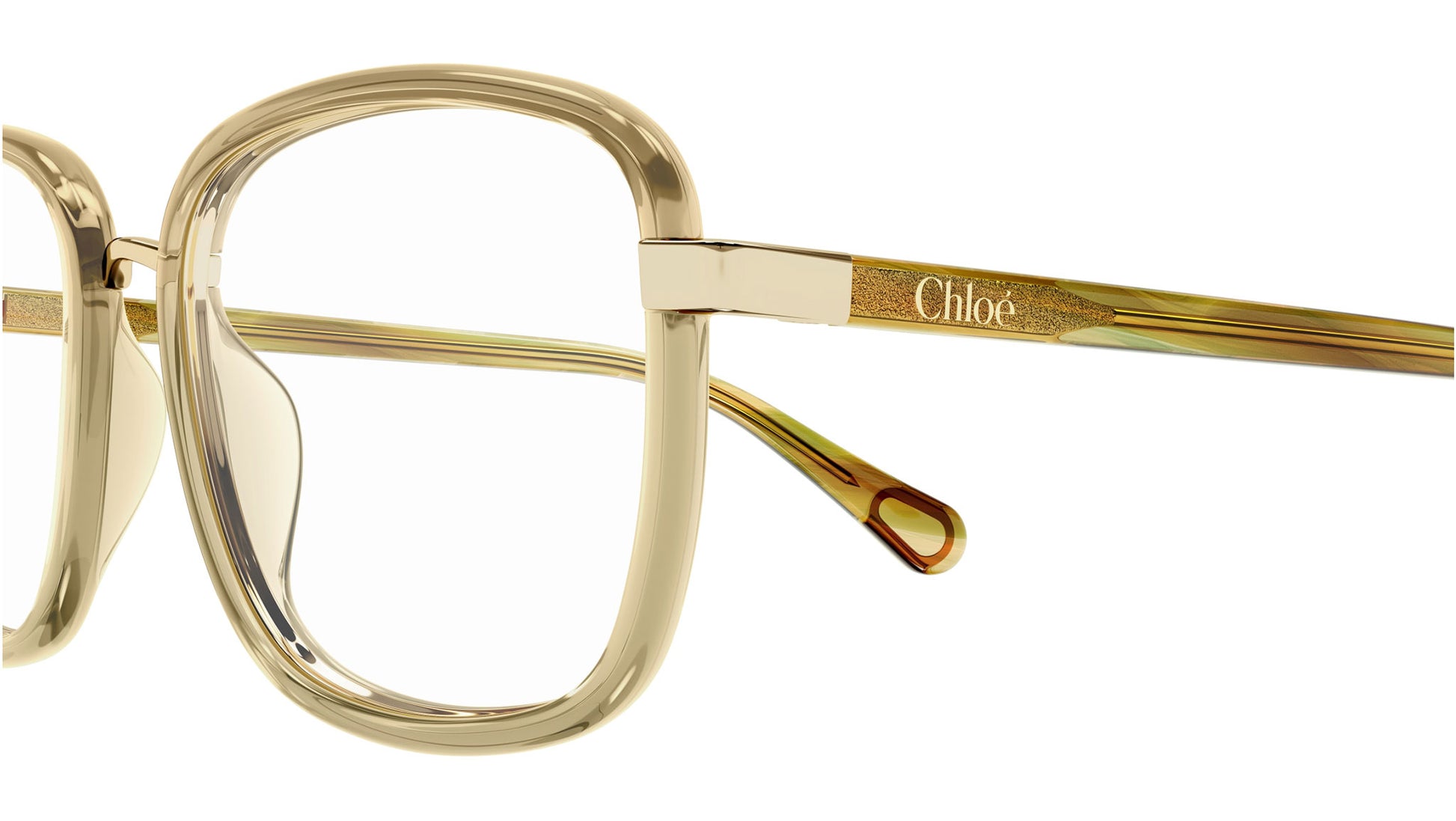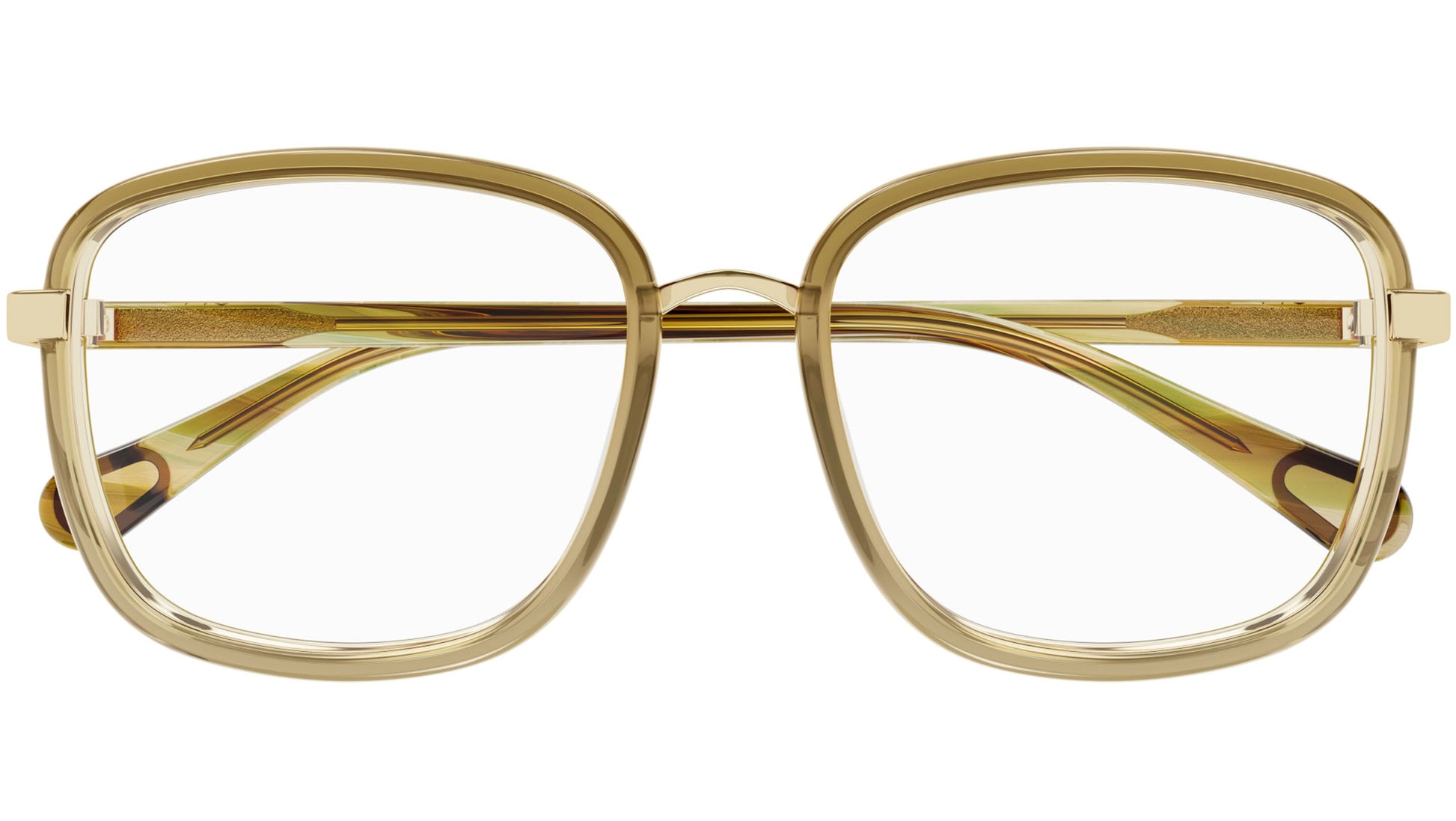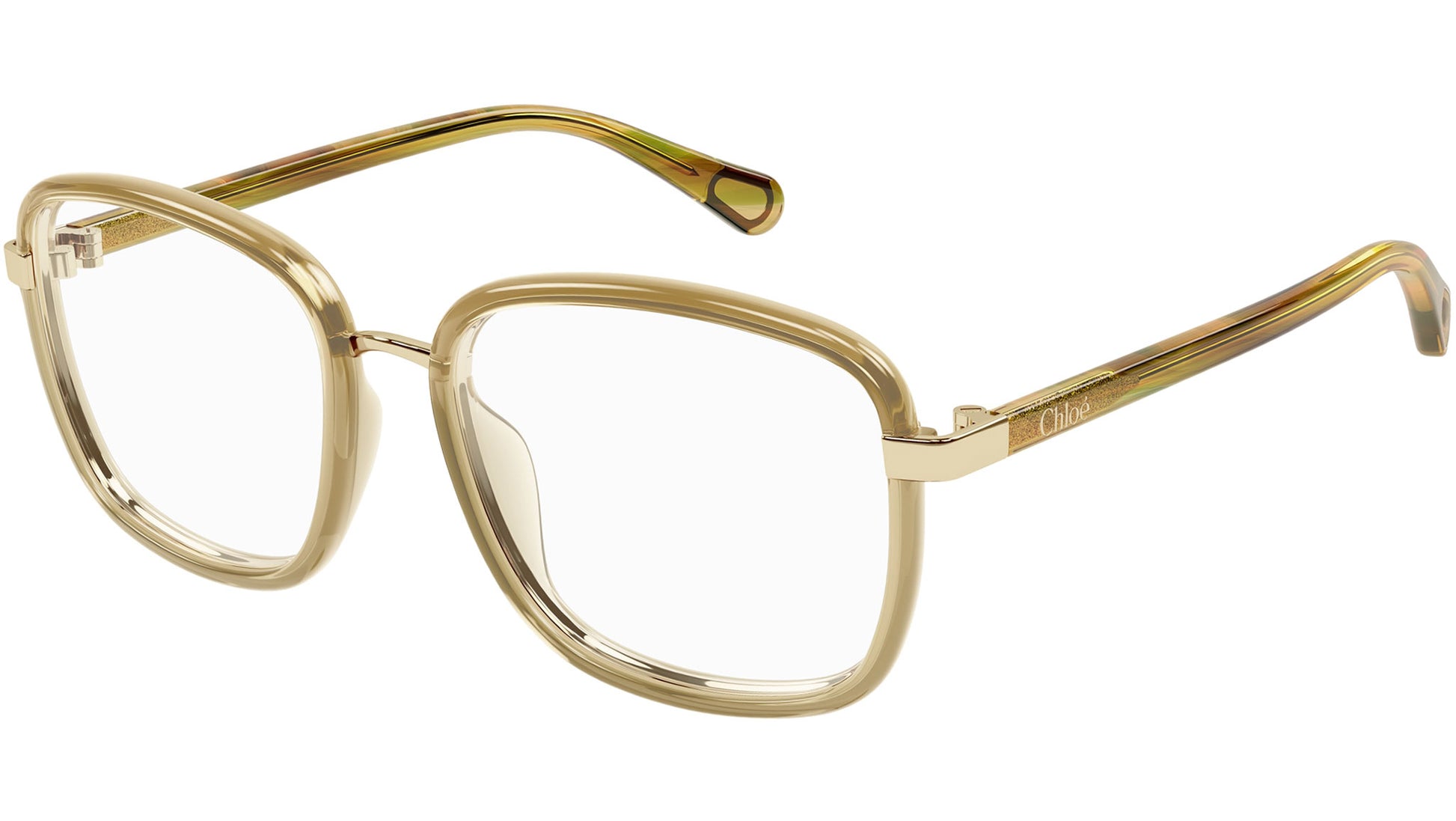 Chloé CC0025O 002 glasses for kids, featuring shiny transparent honey brown rectangular injection frame and demo lenses. Brand line: Kids. Style code: CC0025O. Color code: 002. Made in CN. Authorized Chloé online reseller. Your glasses will include the original case and accessories and are covered by a 12-month global warranty.