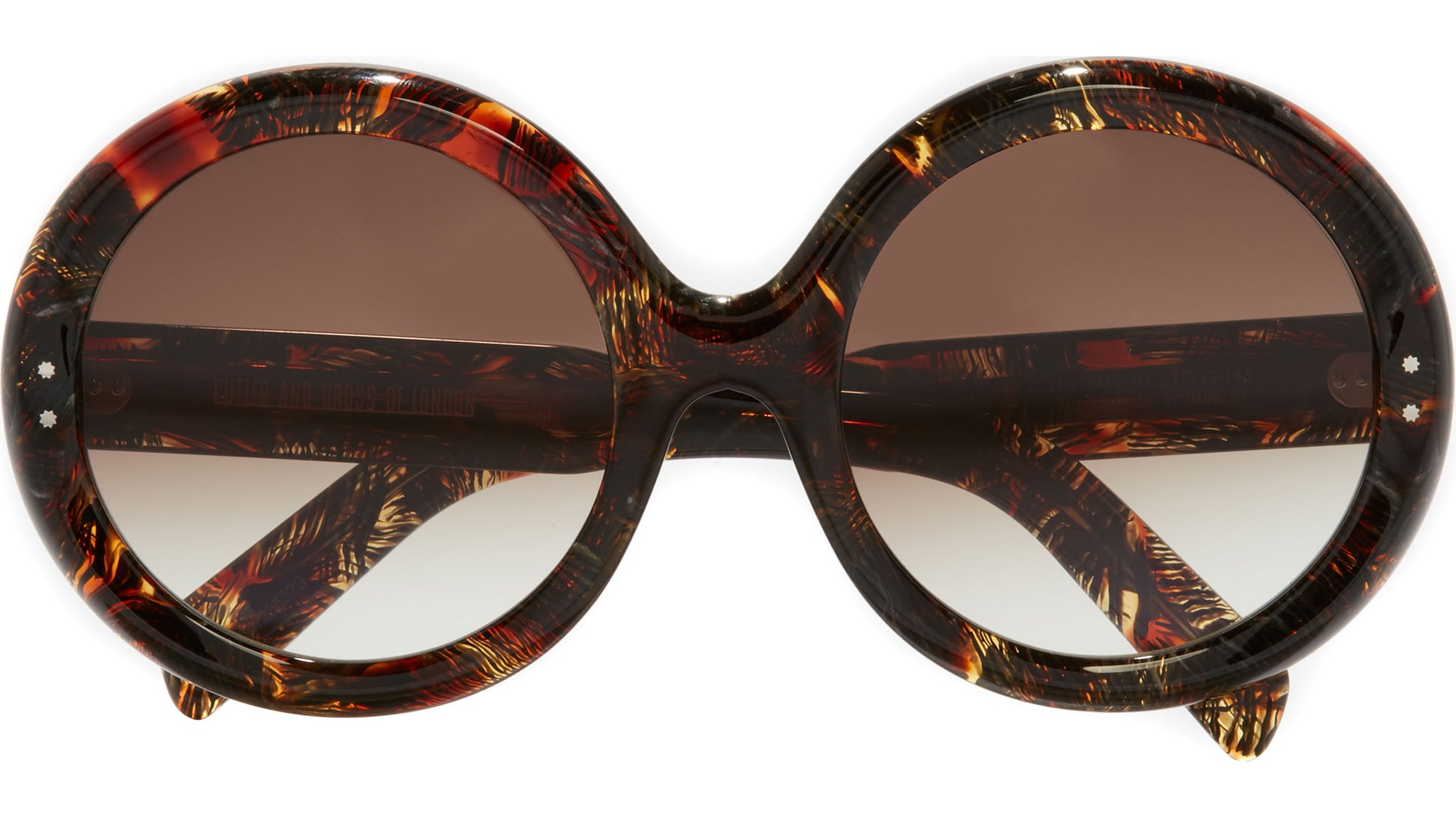 Cutler and Gross 1412 02 sunglasses for women, featuring brush stroke round acetate frame and brown lenses. Cutler and Gross model 1412 glasses showcase a remarkable blend of ingenuity and artistry, featuring a highly specialized milling technique that ensures the rivets securely embrace the lenses. This frame presents a captivating, perfectly round silhouette reminiscent of Cutler and Gross designs from the 1970s. Key specifications include 100% UVA and UVB protective lenses, Compass Star frontal and temple pins, 5-barrel hinges for added durability, Plectrum temples that enhance comfort, and a modernist core wire. Additionally, a gold-foil logo is elegantly displayed on the inner temple. Handcrafted in Italy by skilled artisans, these glasses reflect unparalleled craftsmanship and style. Style code: 1412. Color code: 02. Authorized Cutler and Gross online reseller. Your glasses will include the original case and accessories and are covered by a 12-month global warranty.
