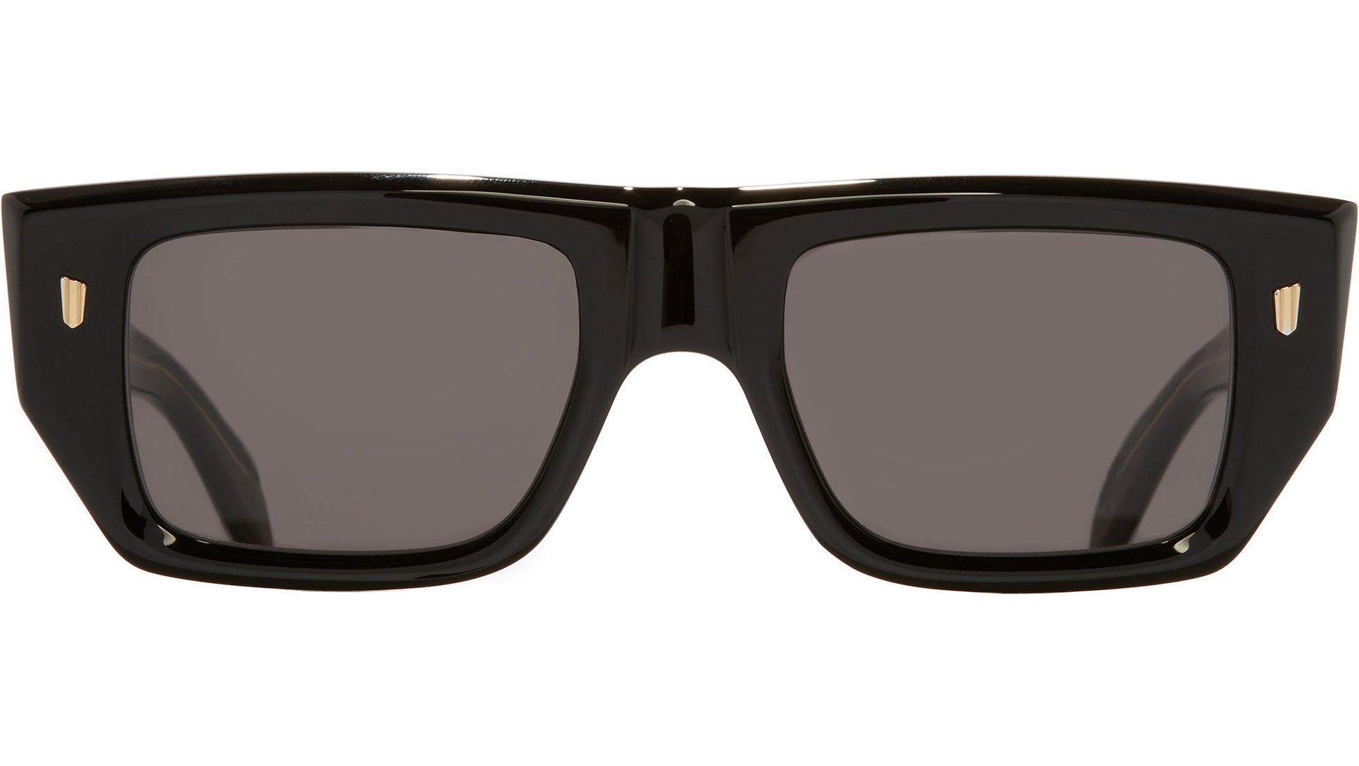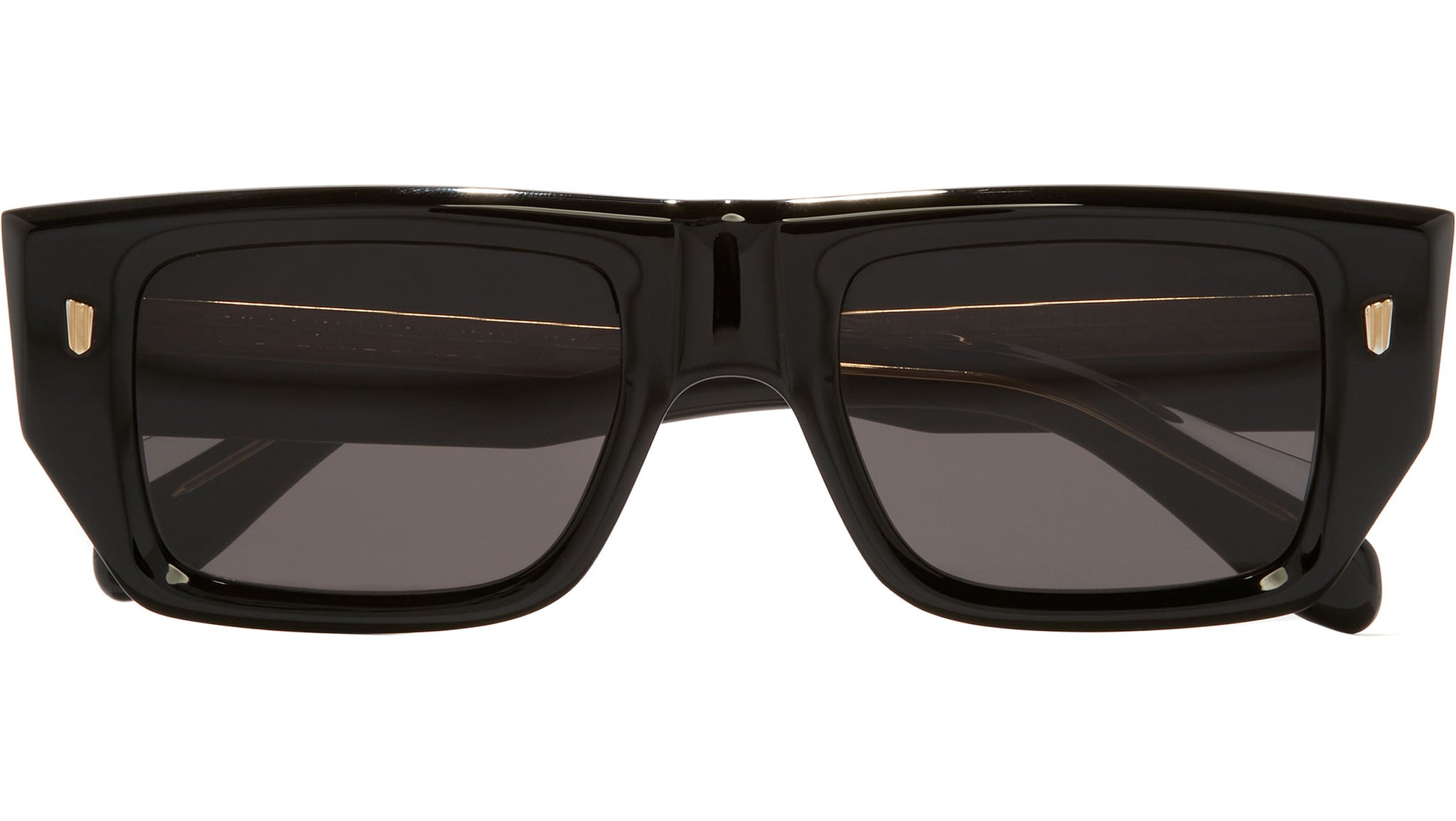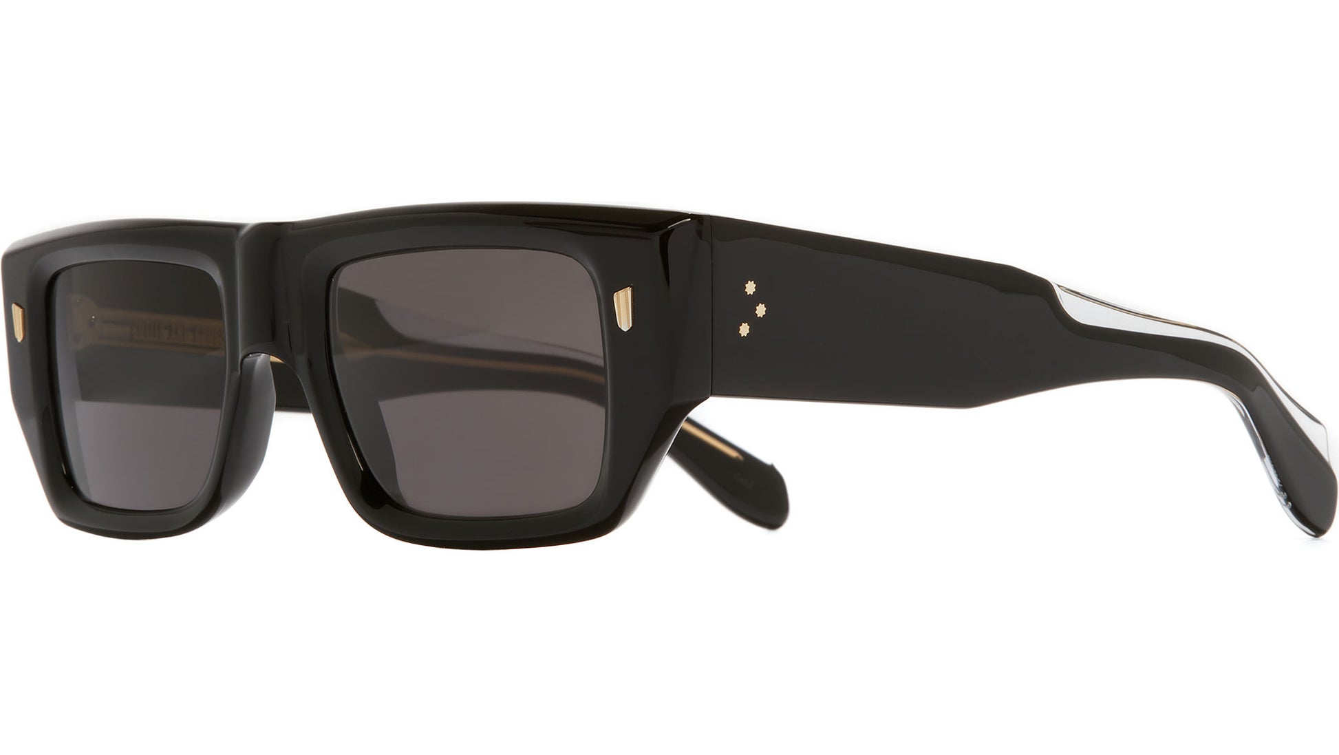 Cutler and Gross 1413 01 sunglasses for men and woman, featuring black on crystal rectangular acetate frame and grey lenses. Cutler and Gross model 1413 sunglasses present a bold square frame design with a distinctive flat top and reversed nose bump, ensuring a striking aesthetic. The robust temples are engineered with 7-barrel hinges and incorporate the signature Modernist core wire for added durability and style. Key features include 100% UVA and UVB protective lenses, Oyster frontal pins, Compass Star temple pins, Fender temples, and a gold-foil logo on the inner temple. Handcrafted in Italy by skilled artisans, these sunglasses embody exceptional quality and craftsmanship. Style code: 1413. Color code: 01. Authorized Cutler and Gross online reseller. Your glasses will include the original case and accessories and are covered by a 12-month global warranty.