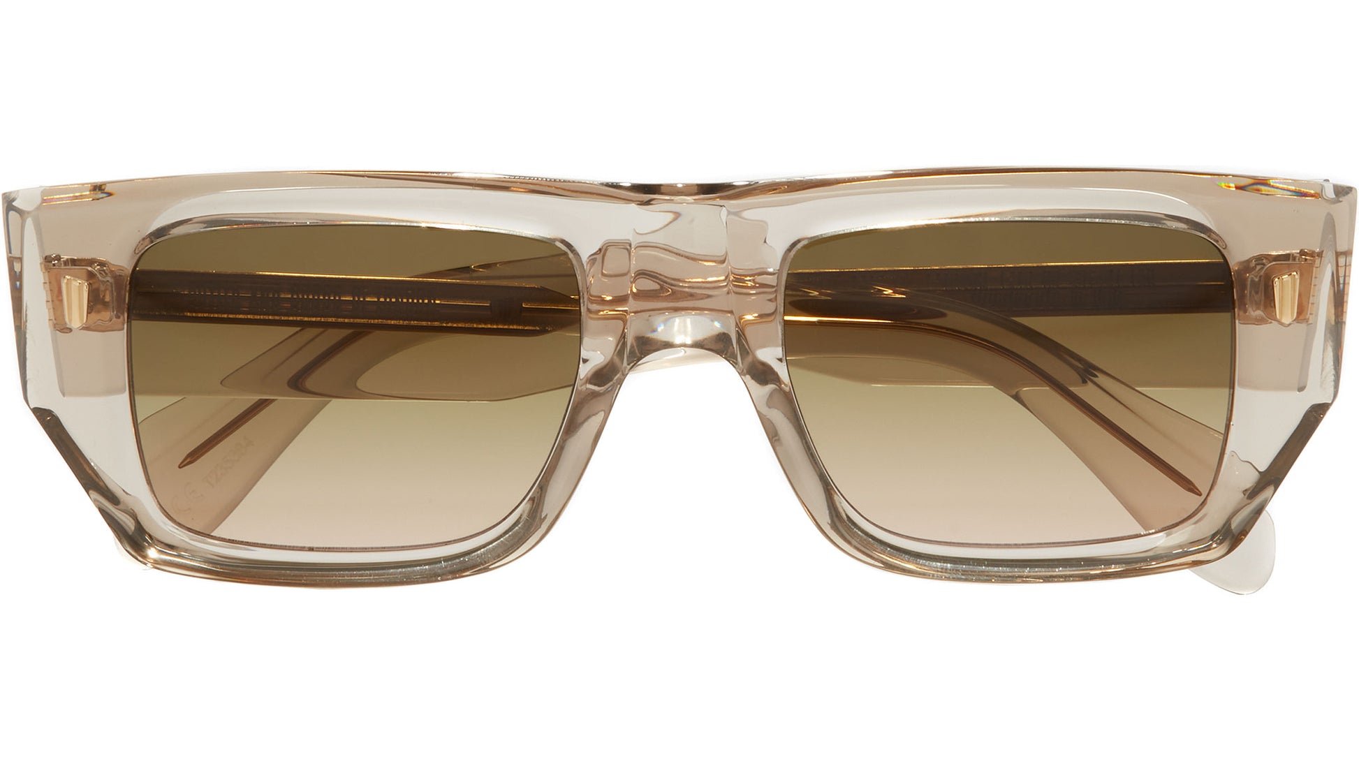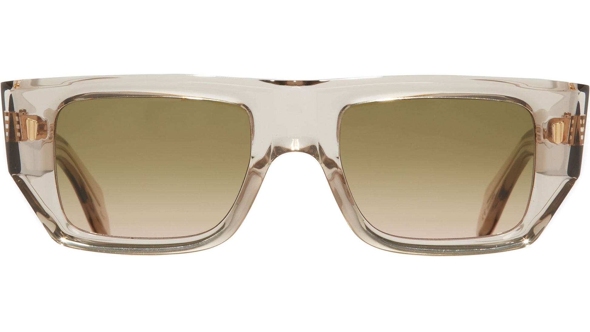 Cutler and Gross 1413 03 sunglasses for men and woman, featuring sand crystal rectangular acetate frame and green lenses. Cutler and Gross model 1413 sunglasses present a bold square frame design with a distinctive flat top and reversed nose bump, ensuring a striking aesthetic. The robust temples are engineered with 7-barrel hinges and incorporate the signature Modernist core wire for added durability and style. Key features include 100% UVA and UVB protective lenses, Oyster frontal pins, Compass Star temple pins, Fender temples, and a gold-foil logo on the inner temple. Handcrafted in Italy by skilled artisans, these sunglasses embody exceptional quality and craftsmanship. Style code: 1413. Color code: 03. Authorized Cutler and Gross online reseller. Your glasses will include the original case and accessories and are covered by a 12-month global warranty.