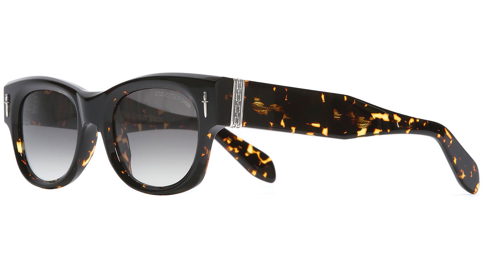 The Halen Square Sunglasses offer a bold reinterpretation of a classic silhouette through the lens of The Great Frog’s distinctive gothic aesthetic. This collaborative design integrates solid Sterling Silver metalwork, with dagger-shaped frontal pins and the Lock Down Chain motif adorning the chunky temples. Hex screws secure the construction, while plectrum-shaped temples and a Lock Down Chain core wire add depth and intrigue. Finished with a gold-foil logo beneath the temples, this frame is as much a statement of craftsmanship as it is of style. Fitted with lenses offering 100% UVA and UVB protection, it exemplifies uncompromising design and rock-inspired luxury.