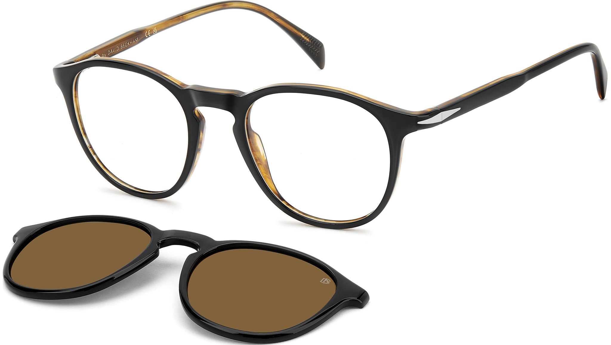 David Beckham DB 1018/C 05K glasses for men, featuring black striped brown panthos acetate frame and demo lens lenses. A sleek evolution of the best-selling Eyewear by David Beckham optical style. These innovative clip-on frames feature ultra-slim acetate profiles for maximum lightness and a refined aesthetic. Designed for everyday use, they include polarized clip-on lenses, uniting a classic panthos design and color palette with innovation and elevated practicality. Brand line: Timeless Icons. Style code: 109803. Color code: 05K. Authorized David Beckham online reseller. Your glasses will include the original case and accessories and are covered by a 12-month global warranty.