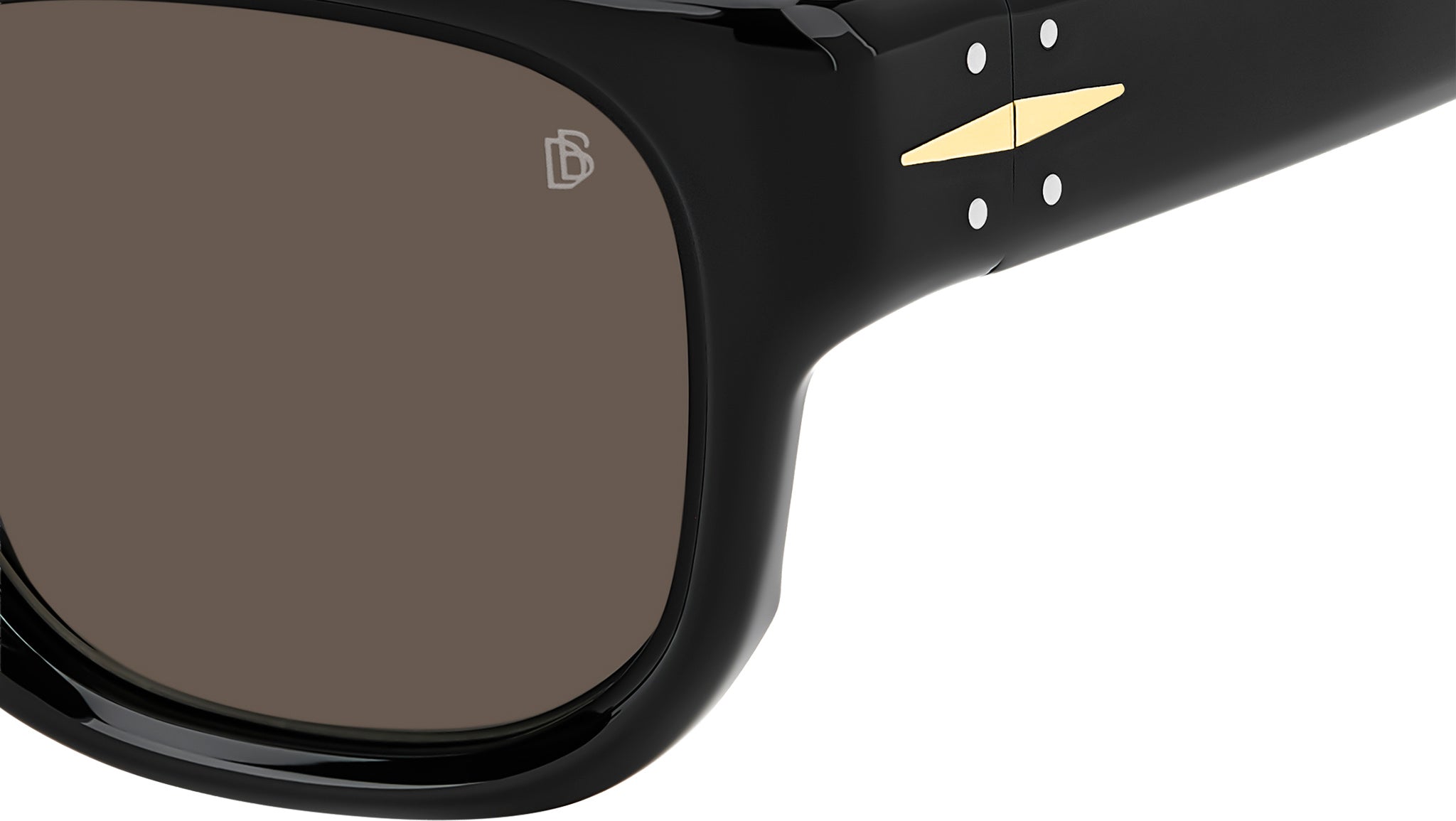 David Beckham DB 7146/S 807 IR sunglasses for men, featuring black squared acetate frame and grey lenses. These David Beckham Eyewear sunglasses showcase sculpted lines with seamless color continuity between the front frame and temples. Bold temples feature the iconic Talisman, highlighted by four new rivets, while exclusive 7-barrel hinges provide enhanced durability and refined strength. Available in sophisticated classic tones and compatible with prescription lenses, a style that perfectly blends elegance and innovation. Brand line: Style Pioneer. Style code: 208159. Color code: 807 IR. Authorized David Beckham online reseller. Your glasses will include the original case and accessories and are covered by a 12-month global warranty.