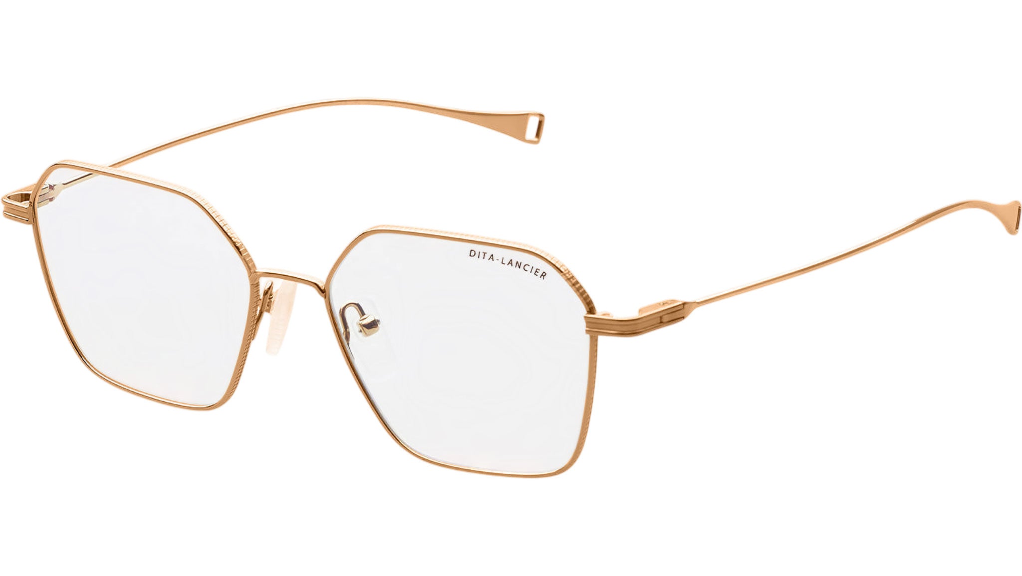 The Dita Lancier LSA-116 optical frame expresses a refined retro character inspired by the fashion history of California, reinterpreted through a precise and contemporary titanium construction. Its distinctive hexagonal silhouette introduces a subtle period-inspired accent, while the lens rim is enhanced by elegant coin-pressed detailing that underscores the frame’s technical sophistication. Crafted with high-quality titanium frame and temples, the design is completed by swadged round-to-flat profile temples with integrated accessory end-tips and adjustable double-injected soft-touch anti-slip nose pads for elevated comfort and stability. Equipped with lenses offering 100% UVA and UVB protection, anti-reflective coating, and a blue light filter, the LSA-116 delivers visual performance with polished everyday appeal. Handcrafted in Japan and available in gold sand, pink gold, and silver, it is presented with a recycled display box, a microfibre lens cleaning cloth, a vegan-suede protective case, and a warranty booklet.