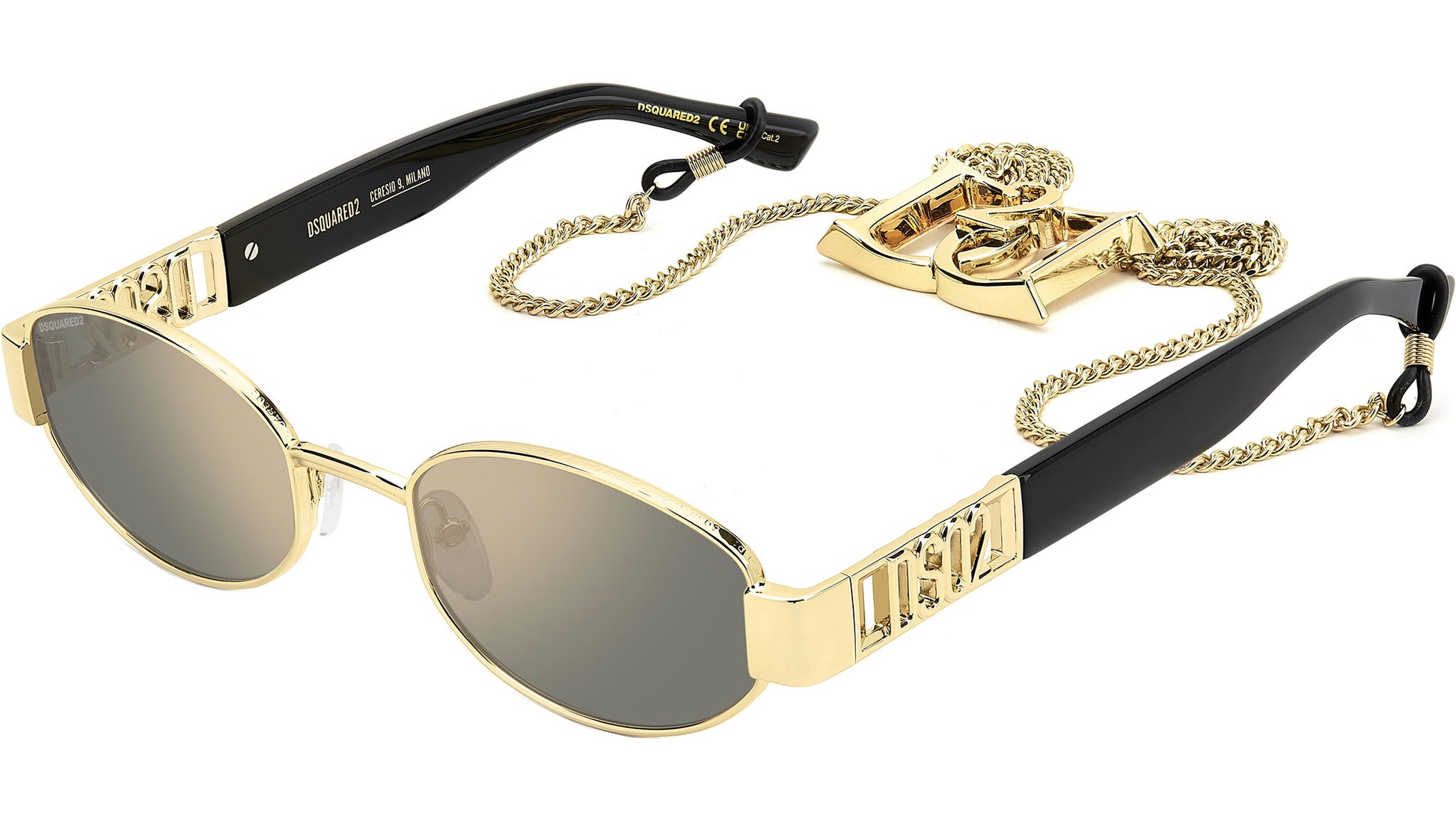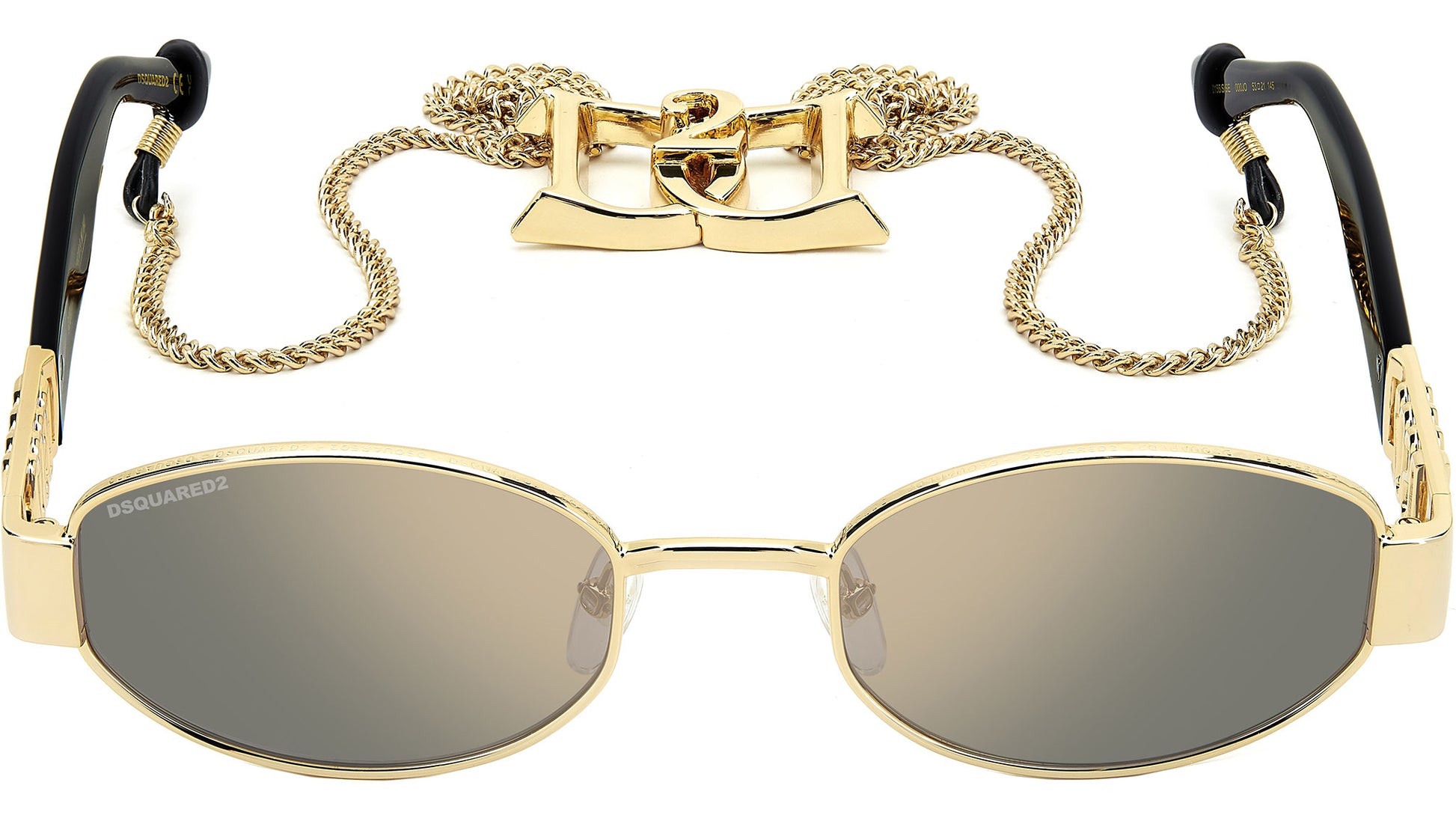 Dsquared2 D2 0155/S/SE 000 JO sunglasses for men, featuring rose gold oval metal frame and grey bronze mirror lenses. These sunglasses bring signature Dsquared2 style to metal rims with a cool oval shape. They come in a special edition with a removable chain in metal. One of a kind, it’s clasped together thanks to magnets concealed in the new interlocking double-D logo. It can be worn closed, like a classic eyewear chain, or open for a red-carpet look. Brand line: Hype. Style code: 207911. Color code: 000 JO. Authorized Dsquared2 online reseller. Your glasses will include the original case and accessories and are covered by a 12-month global warranty.