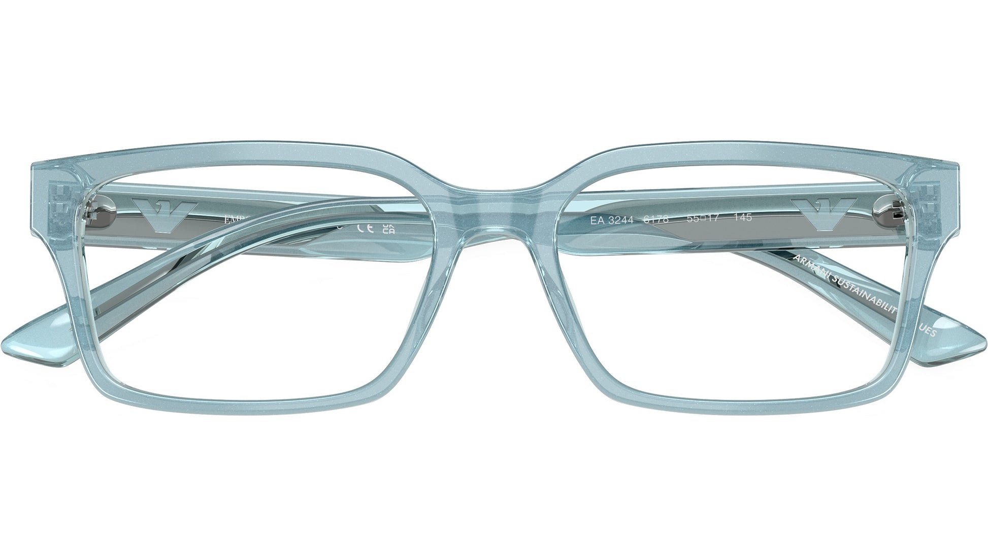 Emporio Armani EA 3244 6178 glasses, featuring iridescent light blue rectangular acetate frame and demo lenses. High bridge fit. Brand line: Essential Leisure. Style code: 0EA3244. Color code: 6178. Authorized Emporio Armani online reseller. Your glasses will include the original case and accessories and are covered by a 12-month global warranty.