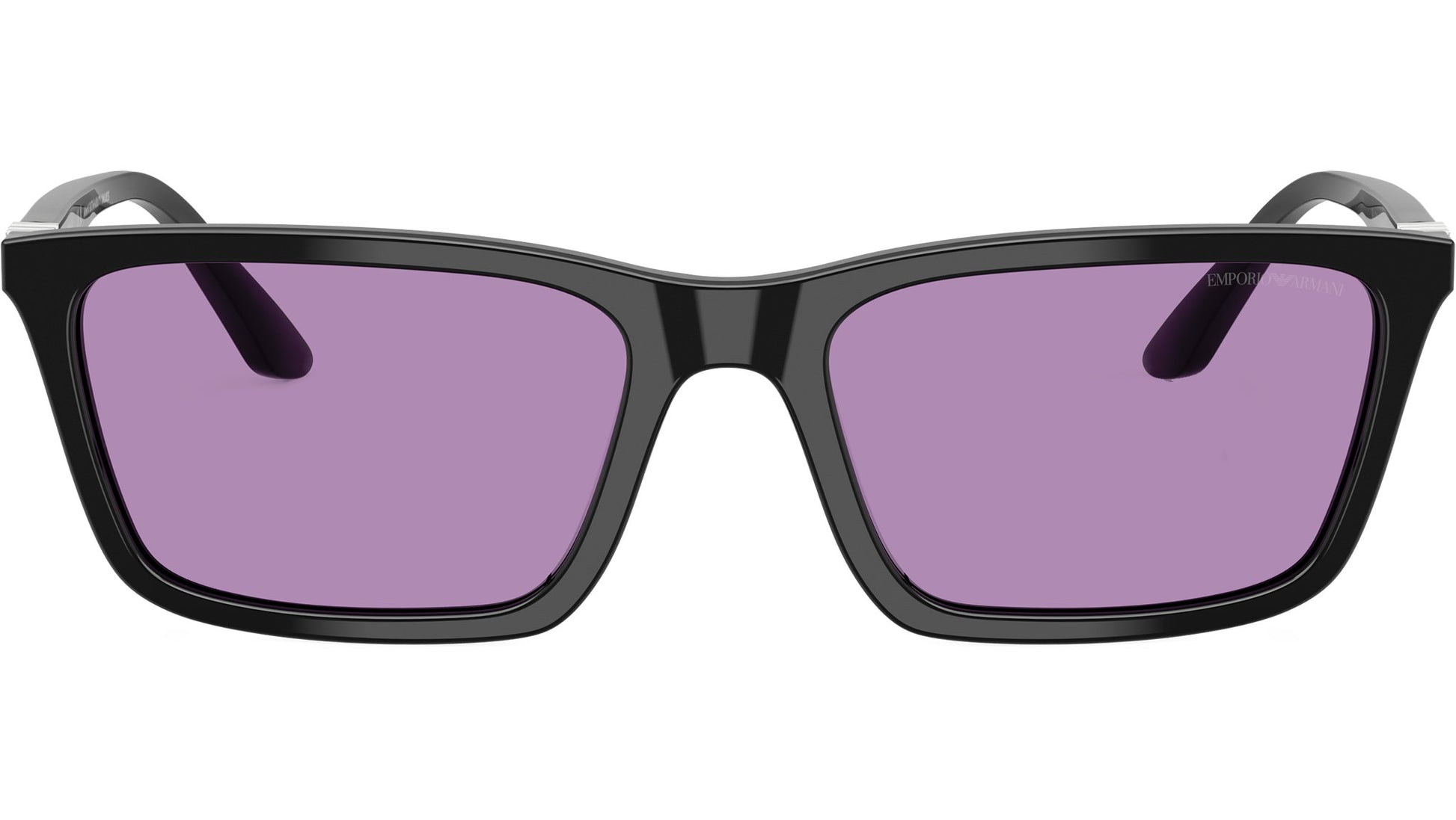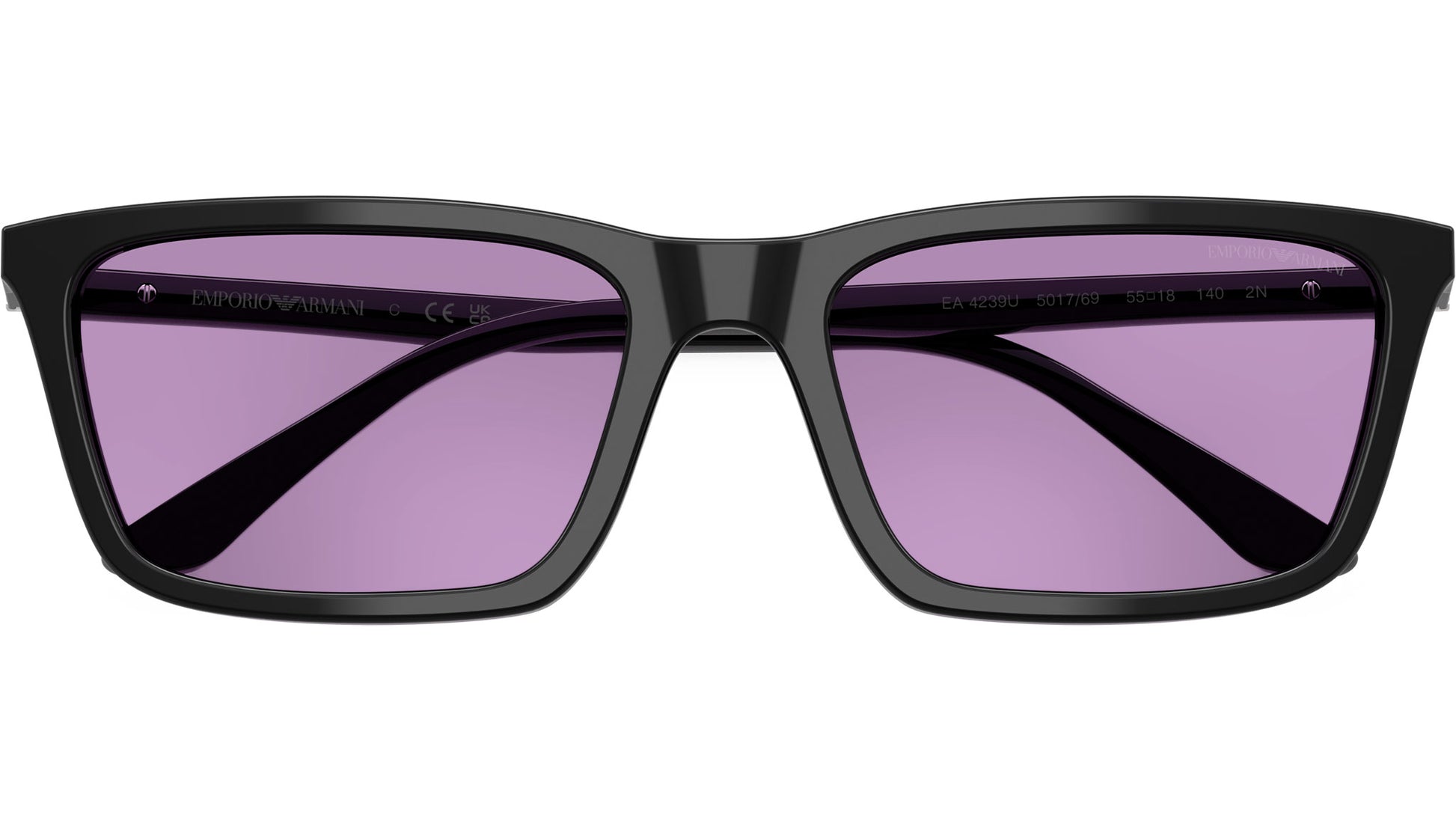 Emporio Armani EA4239U 501769 sunglasses, featuring shiny black rectangular acetate frame and violet bio polyamide lenses. Universal fit. Brand line: Modern. Style code: 0EA4239U. Color code: 501769. Authorized Emporio Armani online reseller. Your glasses will include the original case and accessories and are covered by a 12-month global warranty.