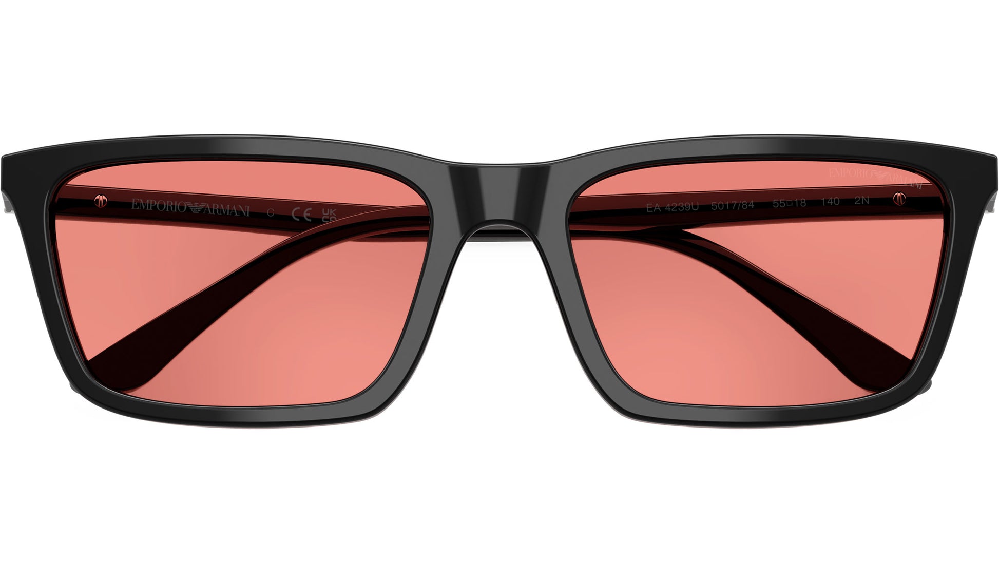 Emporio Armani EA4239U 501784 sunglasses, featuring shiny black rectangular acetate frame and pink bio polyamide lenses. Universal fit. Brand line: Modern. Style code: 0EA4239U. Color code: 501784. Authorized Emporio Armani online reseller. Your glasses will include the original case and accessories and are covered by a 12-month global warranty.