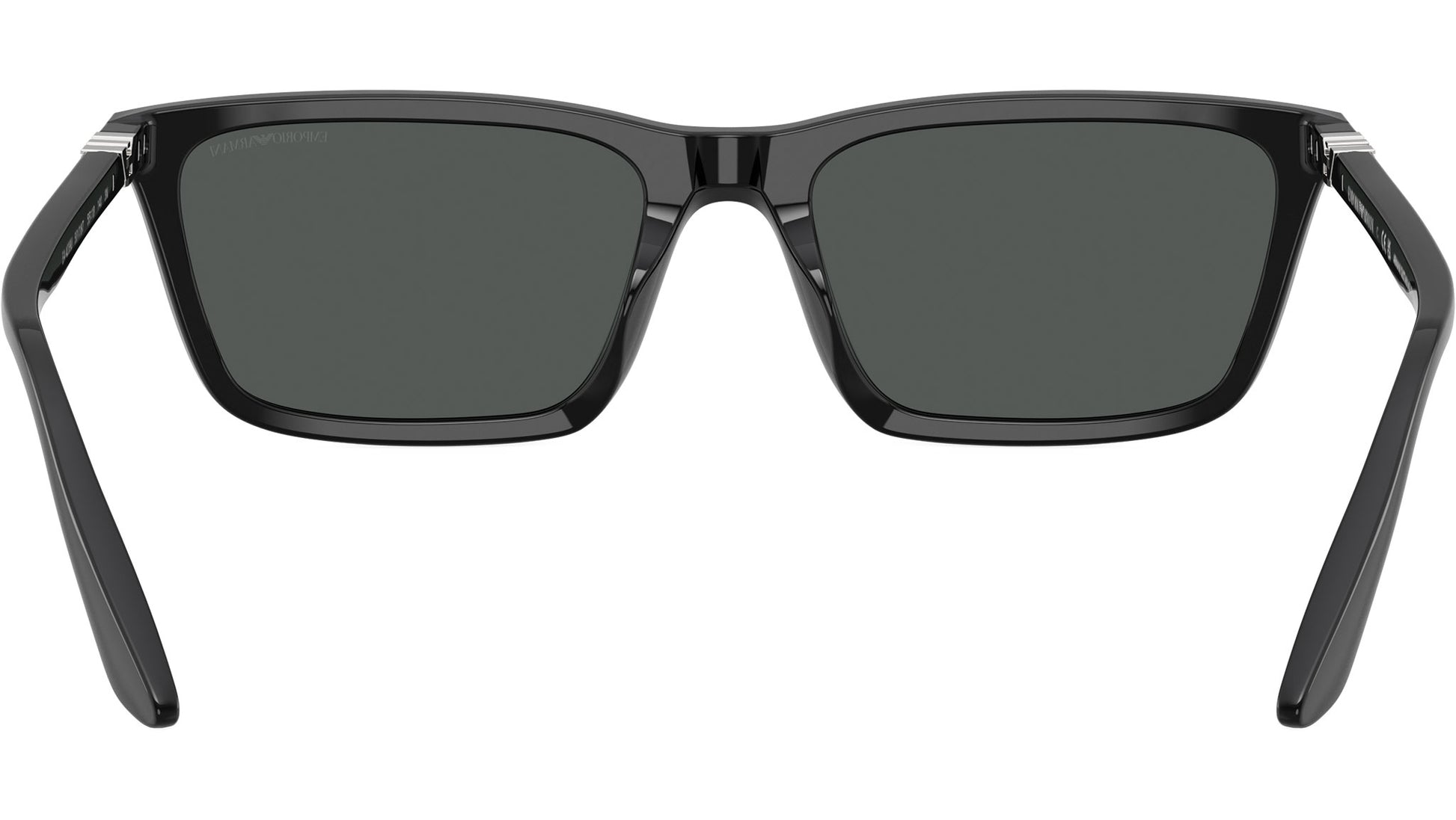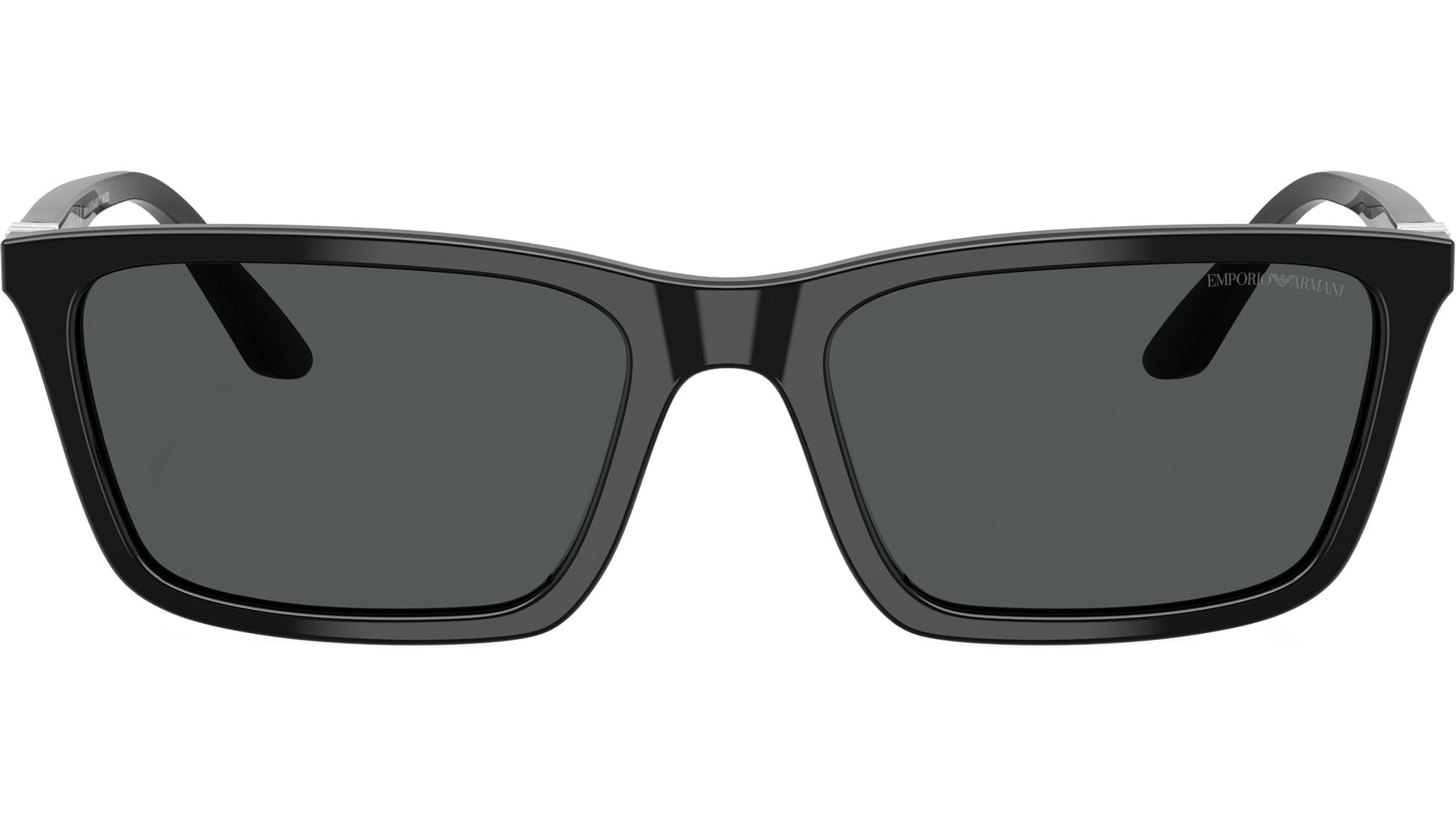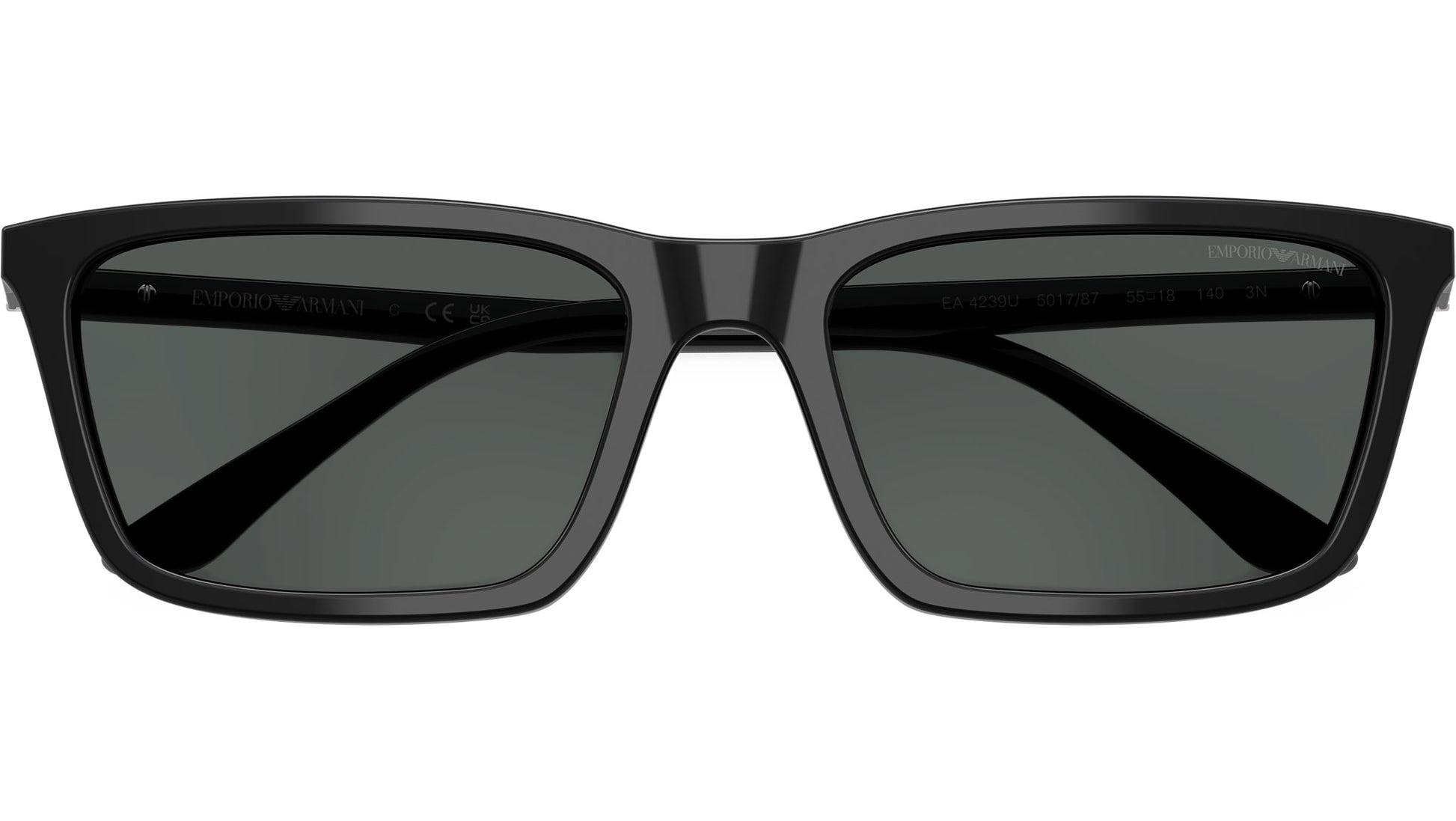 Emporio Armani EA4239U 501787 sunglasses, featuring shiny black rectangular acetate frame and dark grey bio polyamide lenses. Universal fit. Brand line: Modern. Style code: 0EA4239U. Color code: 501787. Authorized Emporio Armani online reseller. Your glasses will include the original case and accessories and are covered by a 12-month global warranty.