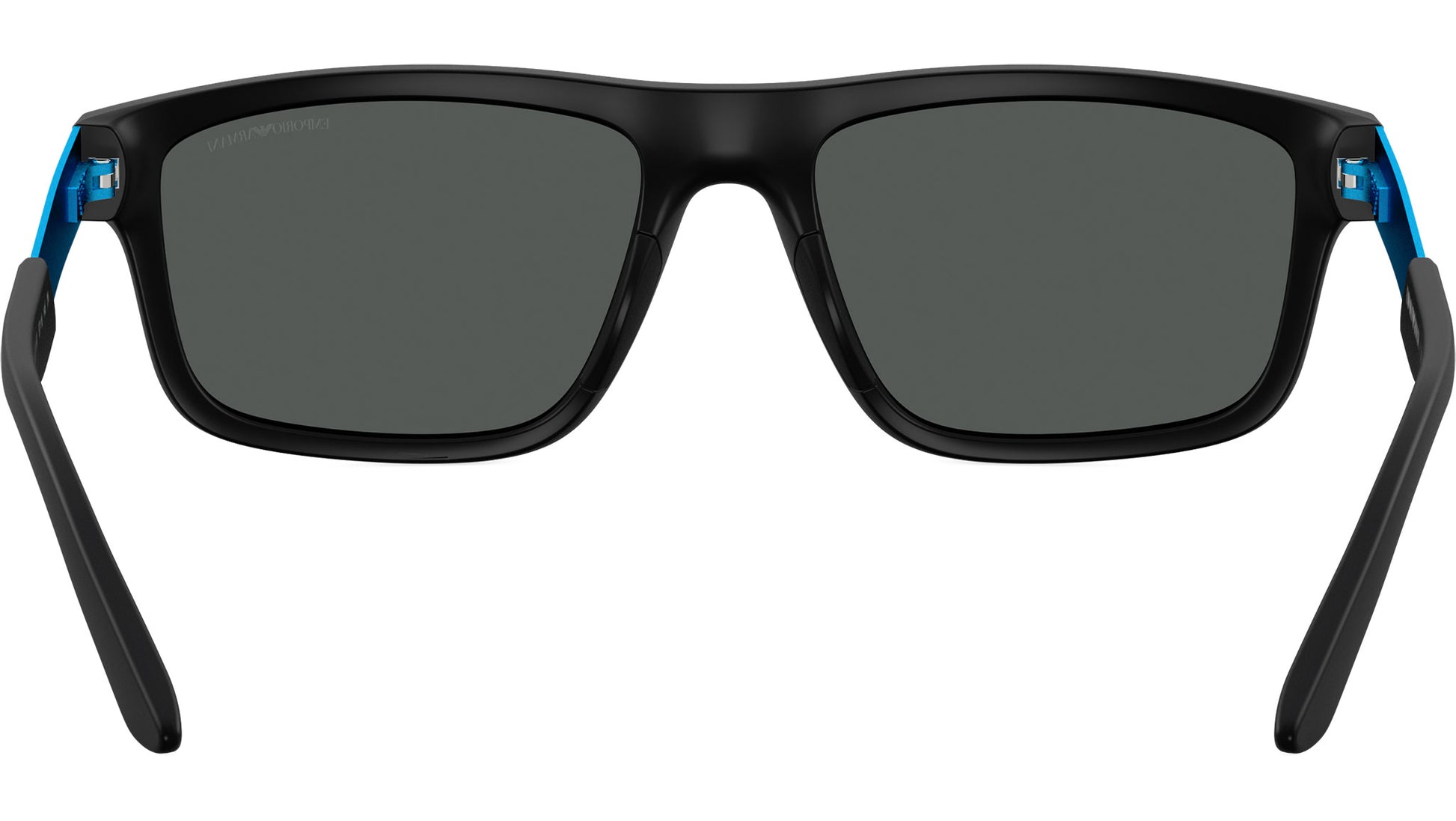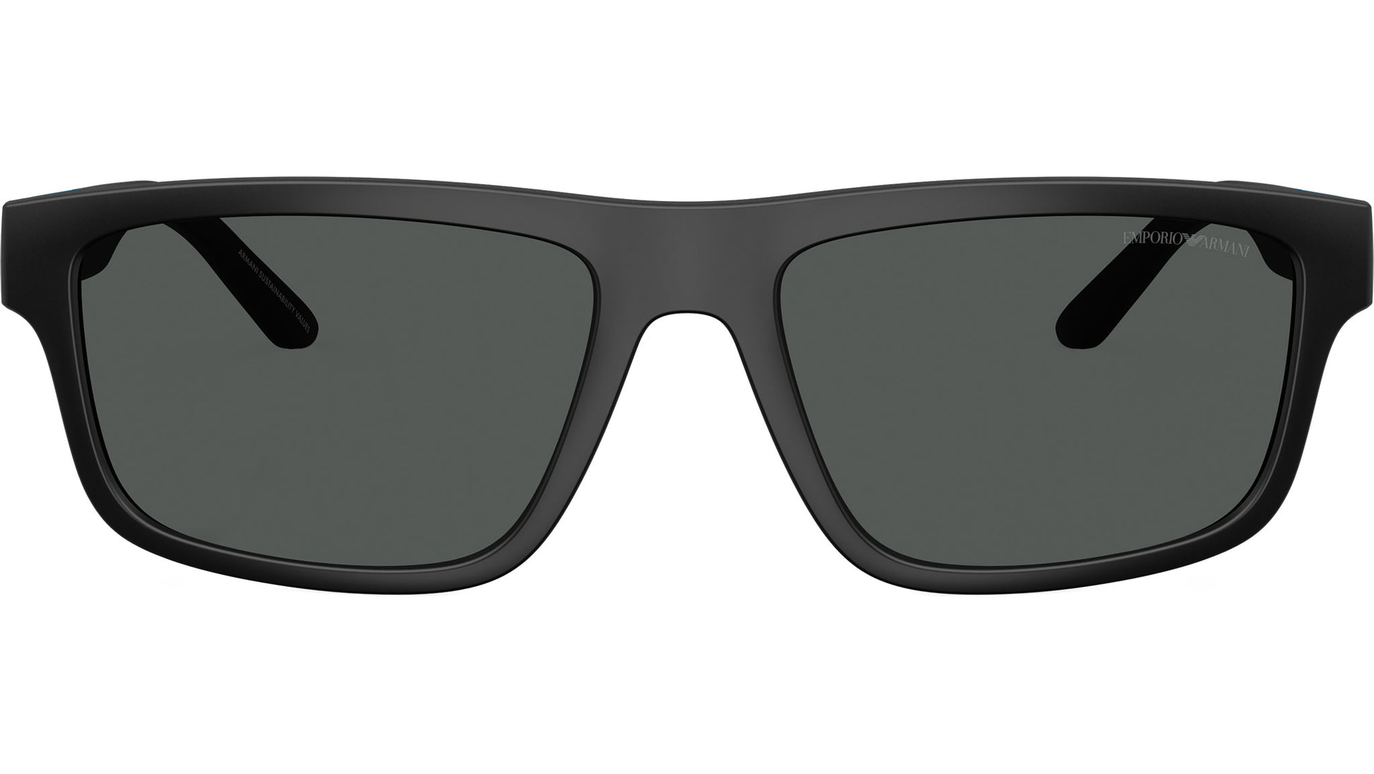 Emporio Armani EA4244U 500187 sunglasses, featuring matte black rectangular injection frame and dark grey bio polyamide lenses. High bridge fit. Brand line: Essential Leisure. Style code: 0EA4244U. Color code: 500187. Authorized Emporio Armani online reseller. Your glasses will include the original case and accessories and are covered by a 12-month global warranty.