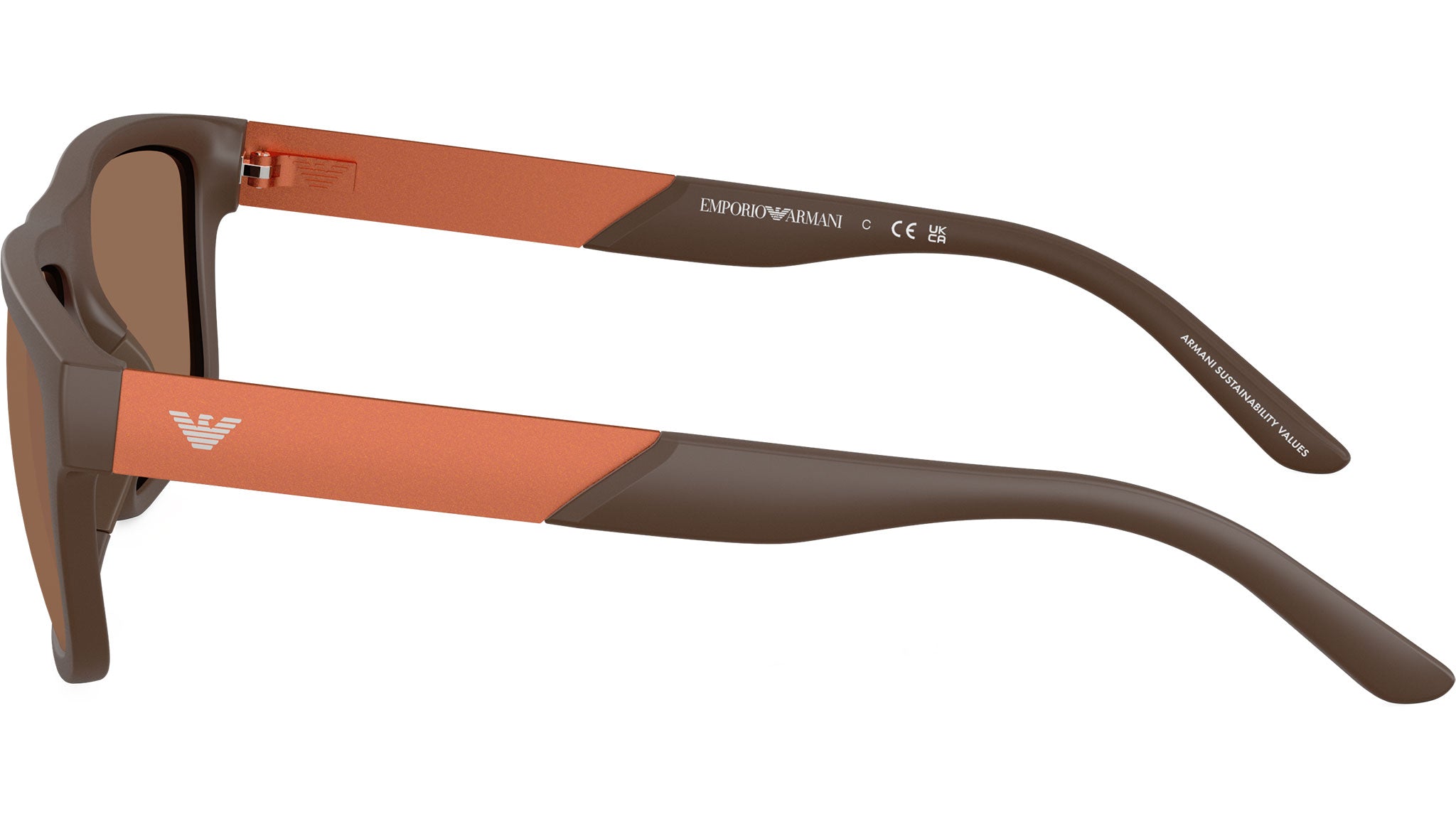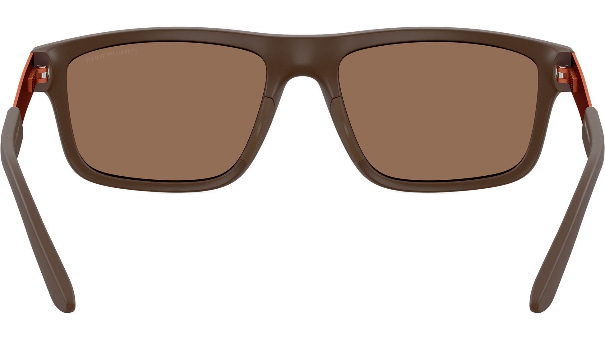 Emporio Armani EA4244U 624373 sunglasses, featuring matte brown rectangular injection frame and dark brown bio polyamide lenses. High bridge fit. Brand line: Essential Leisure. Style code: 0EA4244U. Color code: 624373. Authorized Emporio Armani online reseller. Your glasses will include the original case and accessories and are covered by a 12-month global warranty.