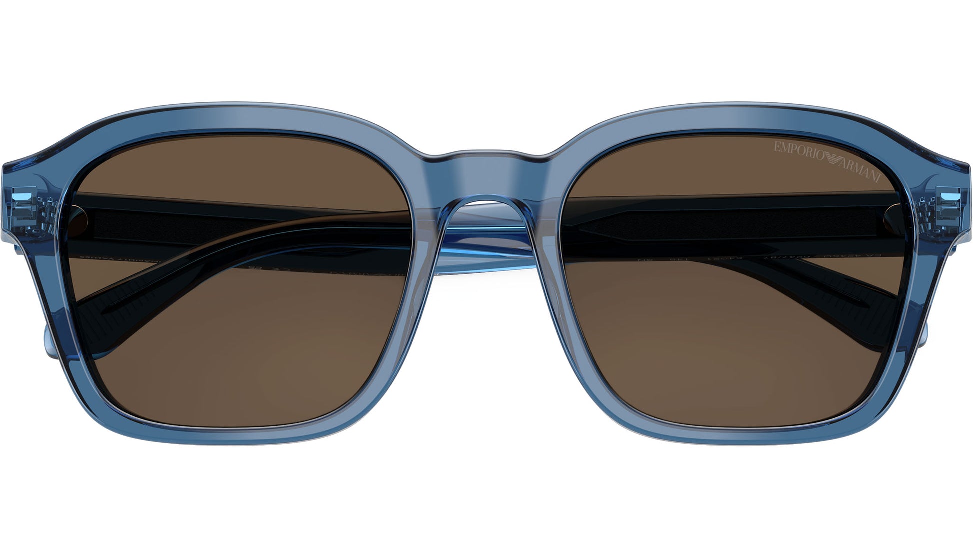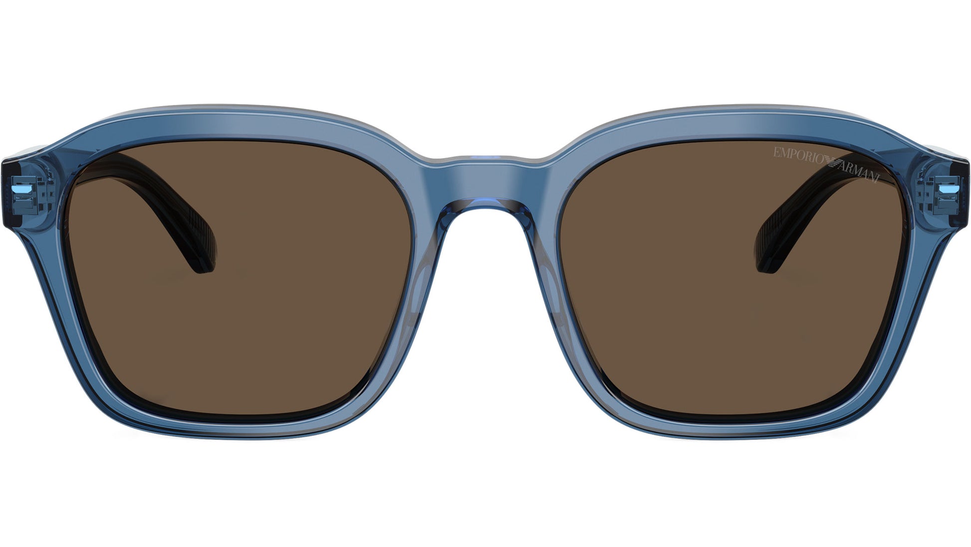 Emporio Armani EA4245U 624787 sunglasses, featuring shiny transparent blue geometric acetate frame and solid brown bio polyamide lenses. Universal fit. Brand line: Essential Leisure. Style code: 0EA4245U. Color code: 624787. Authorized Emporio Armani online reseller. Your glasses will include the original case and accessories and are covered by a 12-month global warranty.
