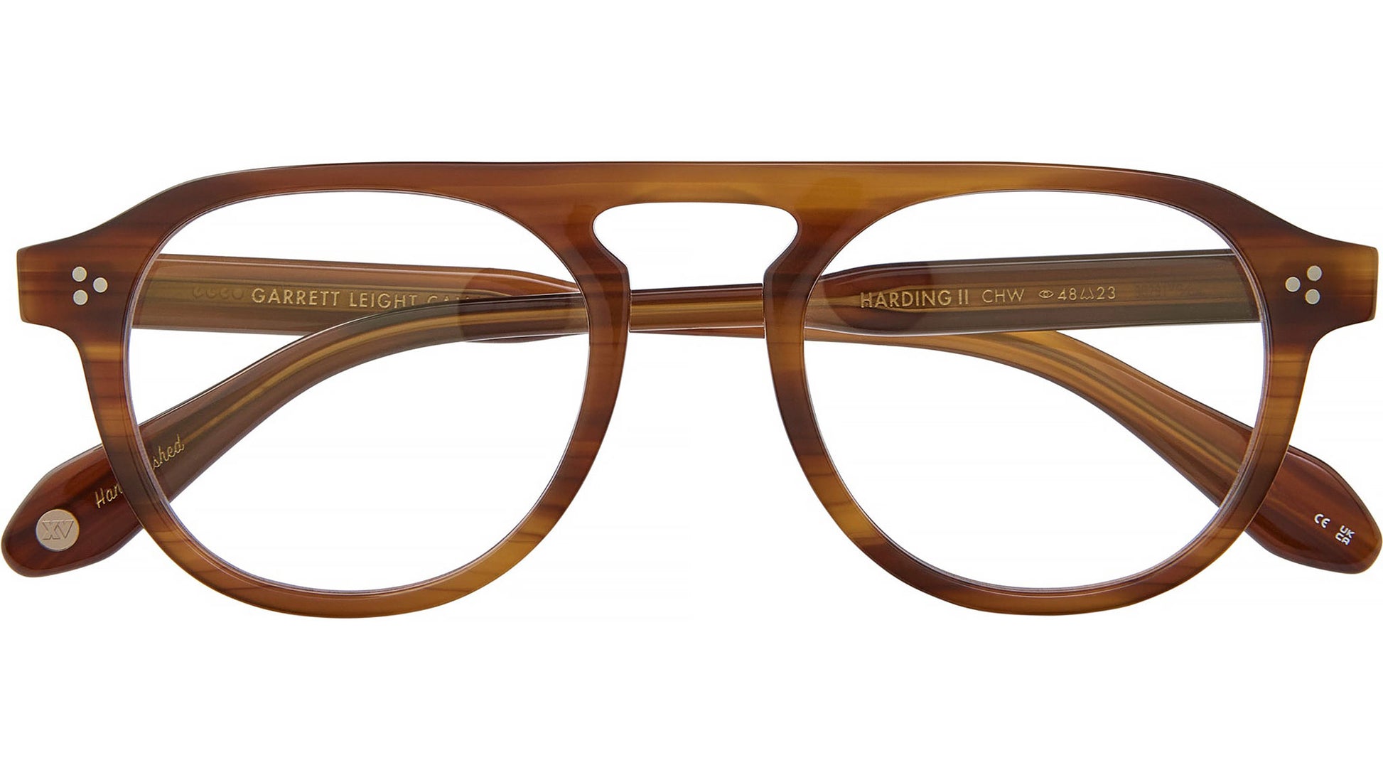 Garrett Leight Harding II glasses featuring cherry wood pilot acetate frame and demo lens lenses. The Garrett Leight Harding II is a modern reinterpretation of a signature GLCO design, offering a sleeker, thinner frame while preserving the timeless appeal of the original. Hand-finished in Japan from cured cellulose acetate, it features the classic GLCO core wire and is detailed with dual-plated rivet hinges and polished pins, reflecting enduring craftsmanship and subtle sophistication. This unisex frame is presented with a seasonal GLCO soft case and cleaning cloth, blending iconic heritage with contemporary refinement. Brand line: GLCO. Style code: 1174. Color code: CHW. Authorized Garrett Leight online reseller. Your glasses will include the original case and accessories and are covered by a 12-month global warranty.