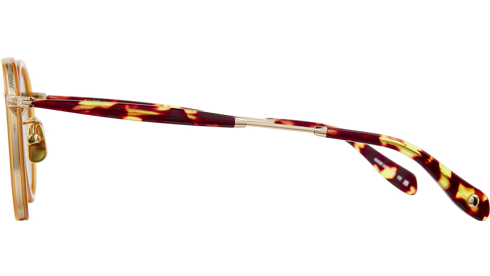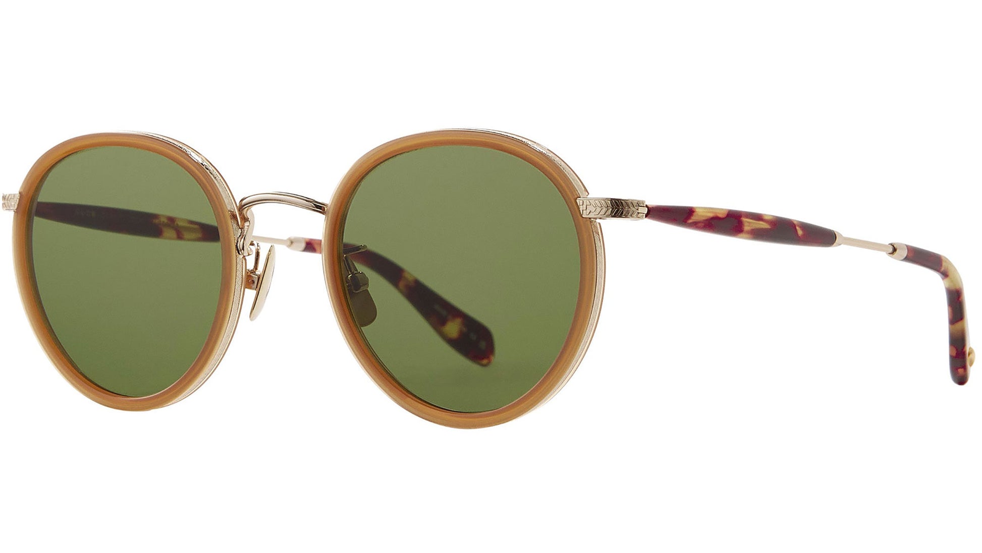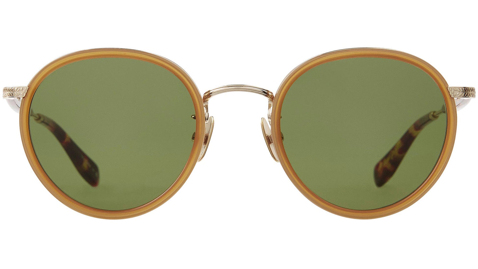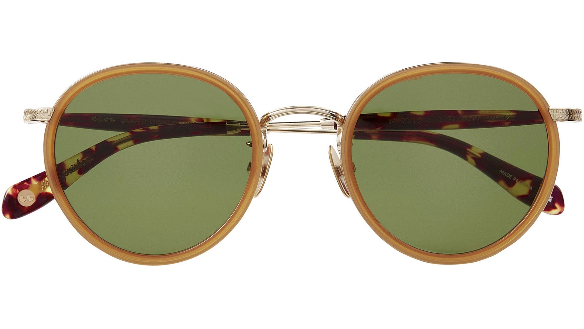 Garrett Leight Wilson X Sun sunglasses featuring summer sun-gold round acetate frame and semi-flat pure green lenses. The Wilson model is enhanced with a thicker insert, showcasing a refined end piece filigree and sculpted temples for improved structural integrity. This eyewear features screw-in titanium nose pads for enhanced comfort and provides 100% UV protection. Crafted with premium glass lenses and cured cellulose acetate incorporating a classic core wire, it offers a 2 base lens with a backside anti-reflective coating. The design is further strengthened by 5 barrel hinges that utilize real rivets and external pins at the temples. Each pair includes a soft case and cleaning cloth for maintenance and portability. Brand line: Forever Classics. Style code: 4075. Color code: SUS-G/SFPGN. Authorized Garrett Leight online reseller. Your glasses will include the original case and accessories and are covered by a 12-month global warranty.