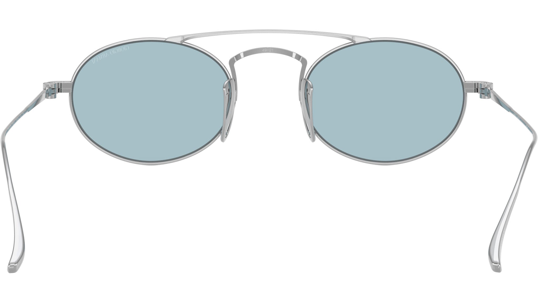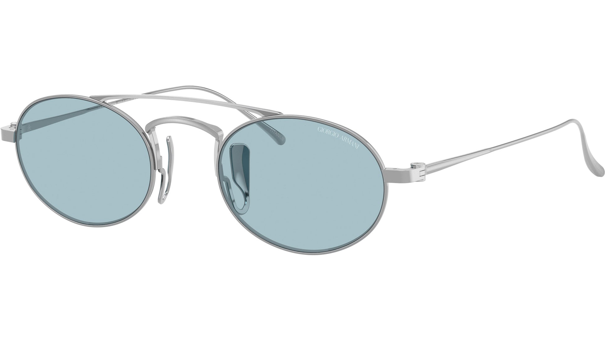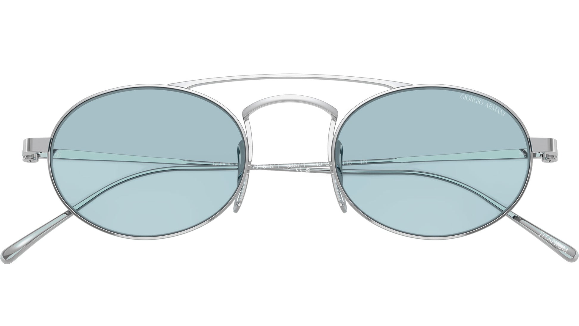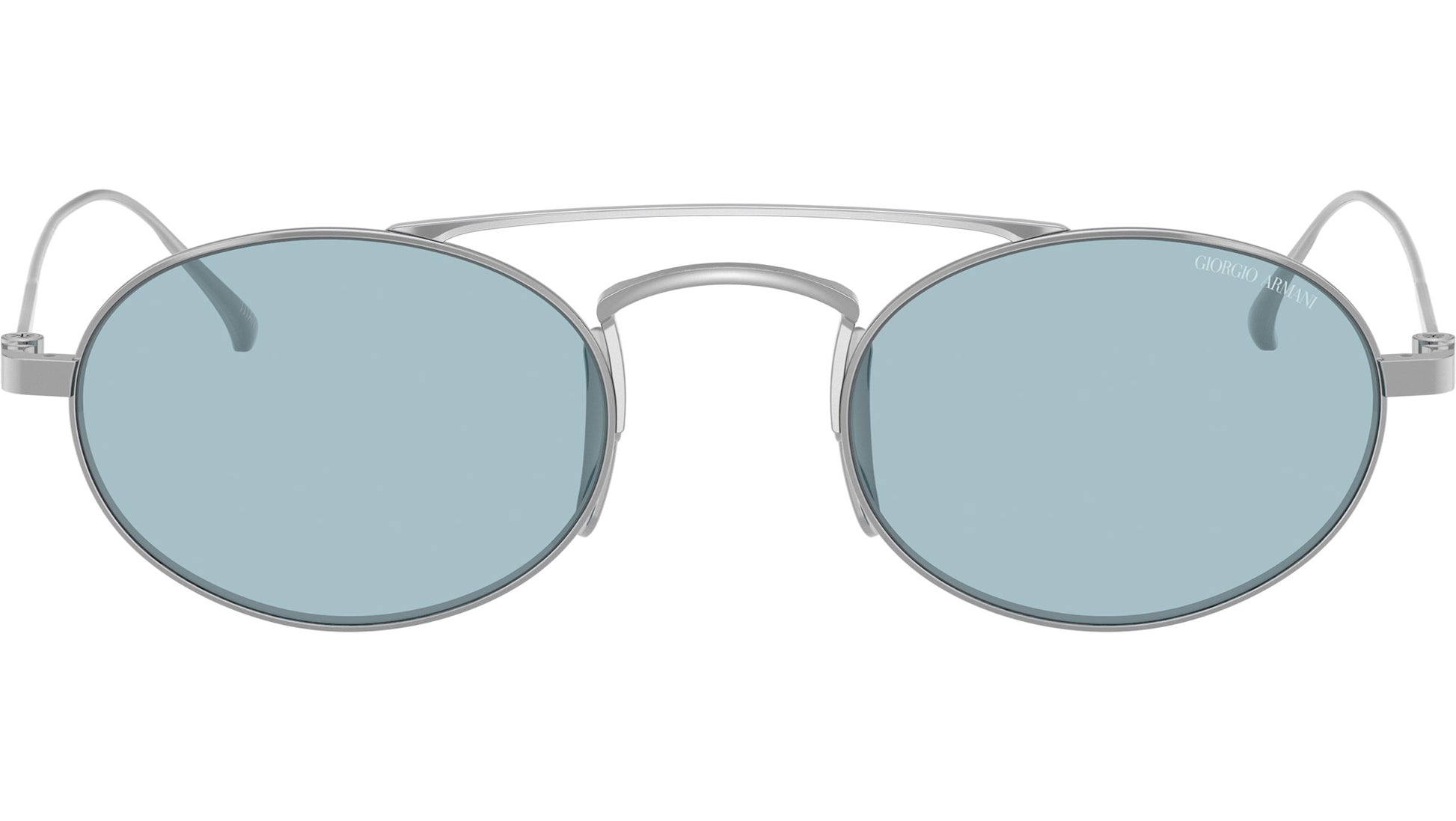 Giorgio Armani AR 6161T 3387/1 sunglasses, featuring silver oval titanium frame and light blue polyamide lenses. Adjustable nosepads. Brand line: Armani Code. Style code: 0AR6161T. Color code: 3387/1. Authorized Giorgio Armani online reseller. Your glasses will include the original case and accessories and are covered by a 12-month global warranty.