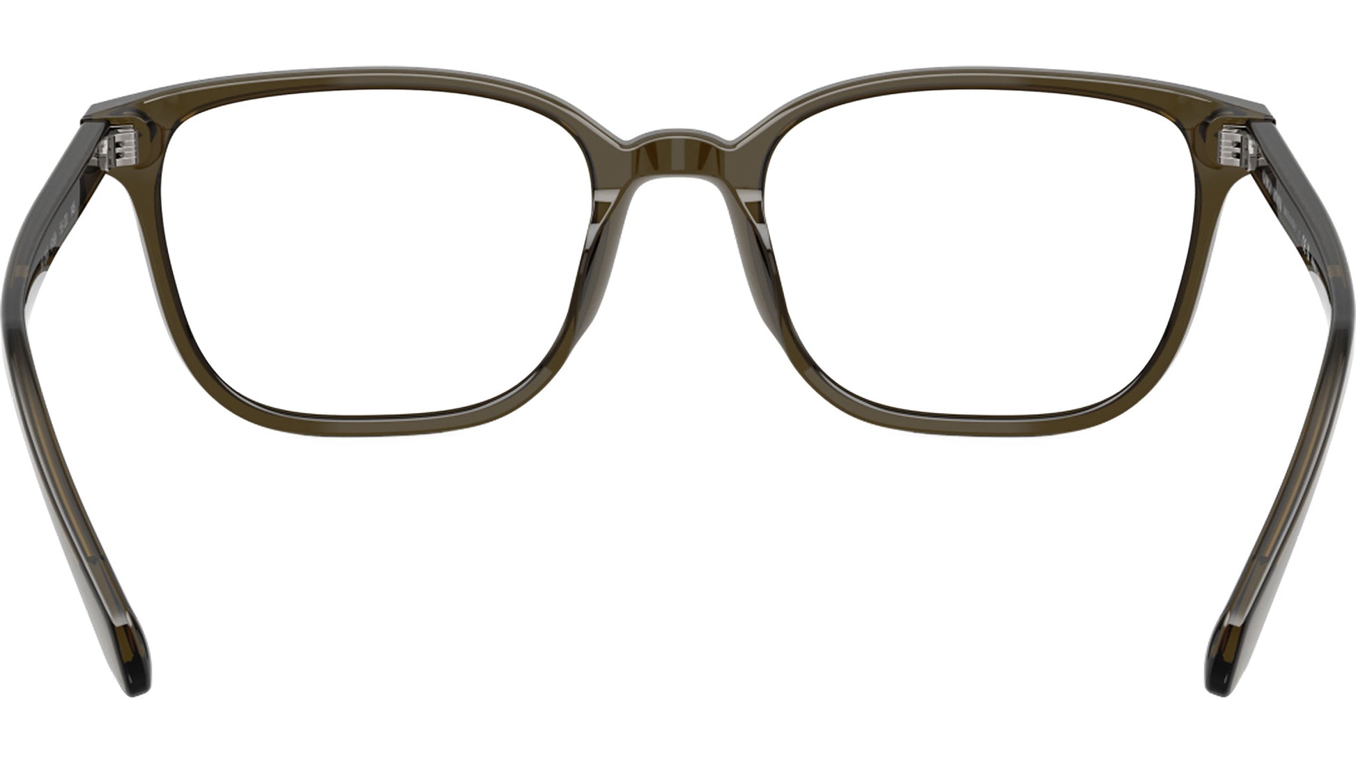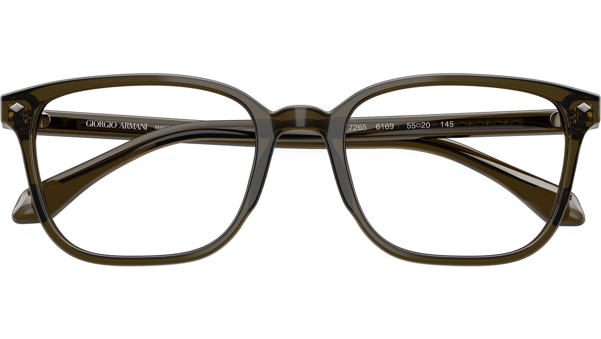 Giorgio Armani AR 7265 6169 glasses, featuring transparent green d-frame acetate frame and demo lenses. High bridge fit. Brand line: Armani Code. Style code: 0AR7265. Color code: 6169. Authorized Giorgio Armani online reseller. Your glasses will include the original case and accessories and are covered by a 12-month global warranty.