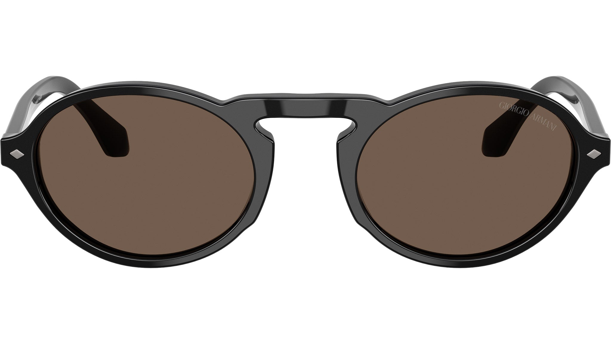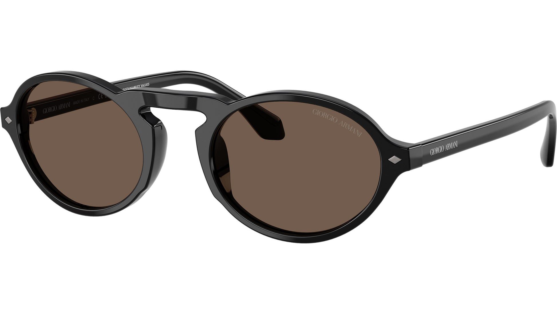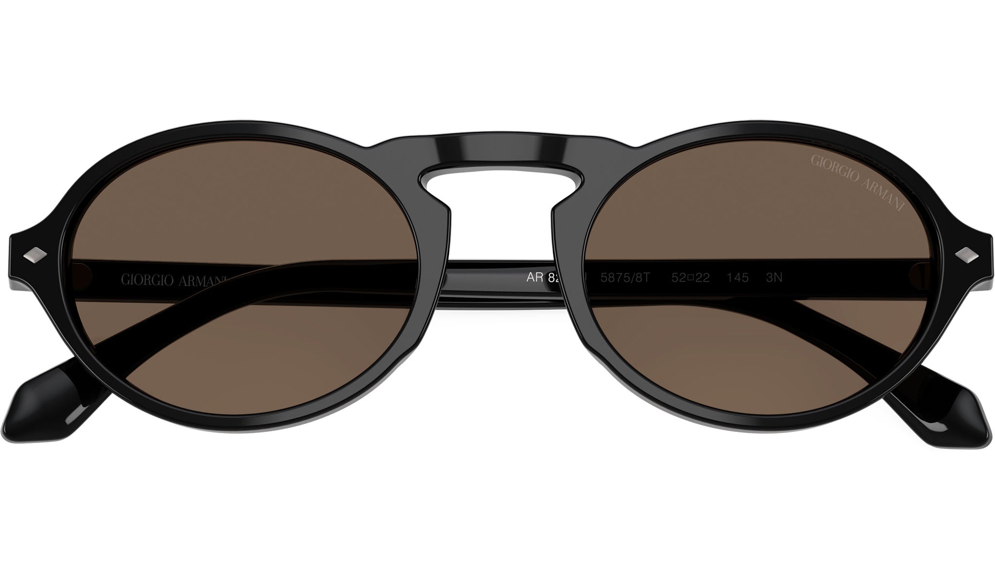 Giorgio Armani AR 8219U 58758T sunglasses, featuring black oval acetate frame and dark brown glass lenses. Universal fit. Brand line: Armani Code. Style code: 0AR8219U. Color code: 58758T. Authorized Giorgio Armani online reseller. Your glasses will include the original case and accessories and are covered by a 12-month global warranty.