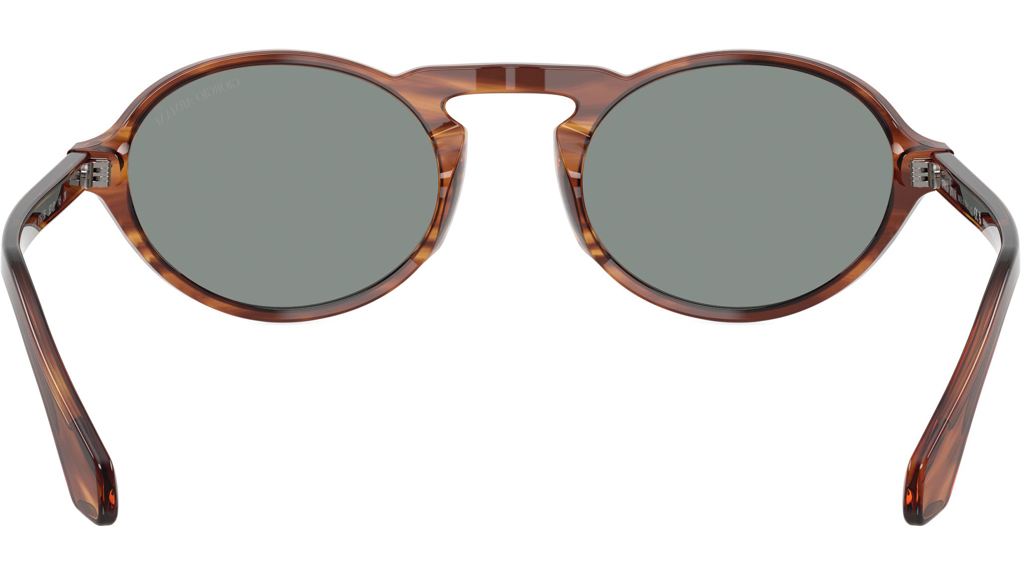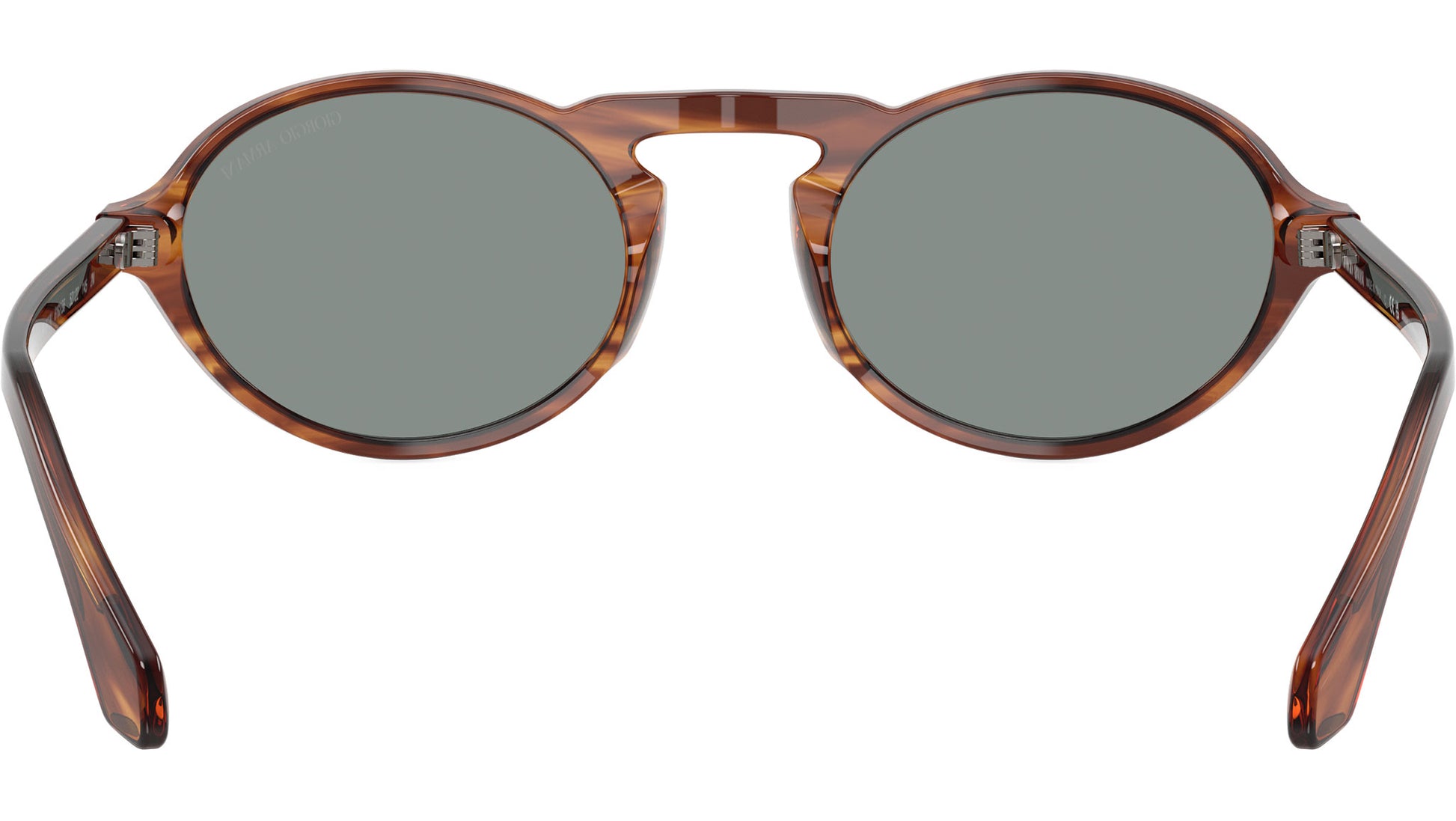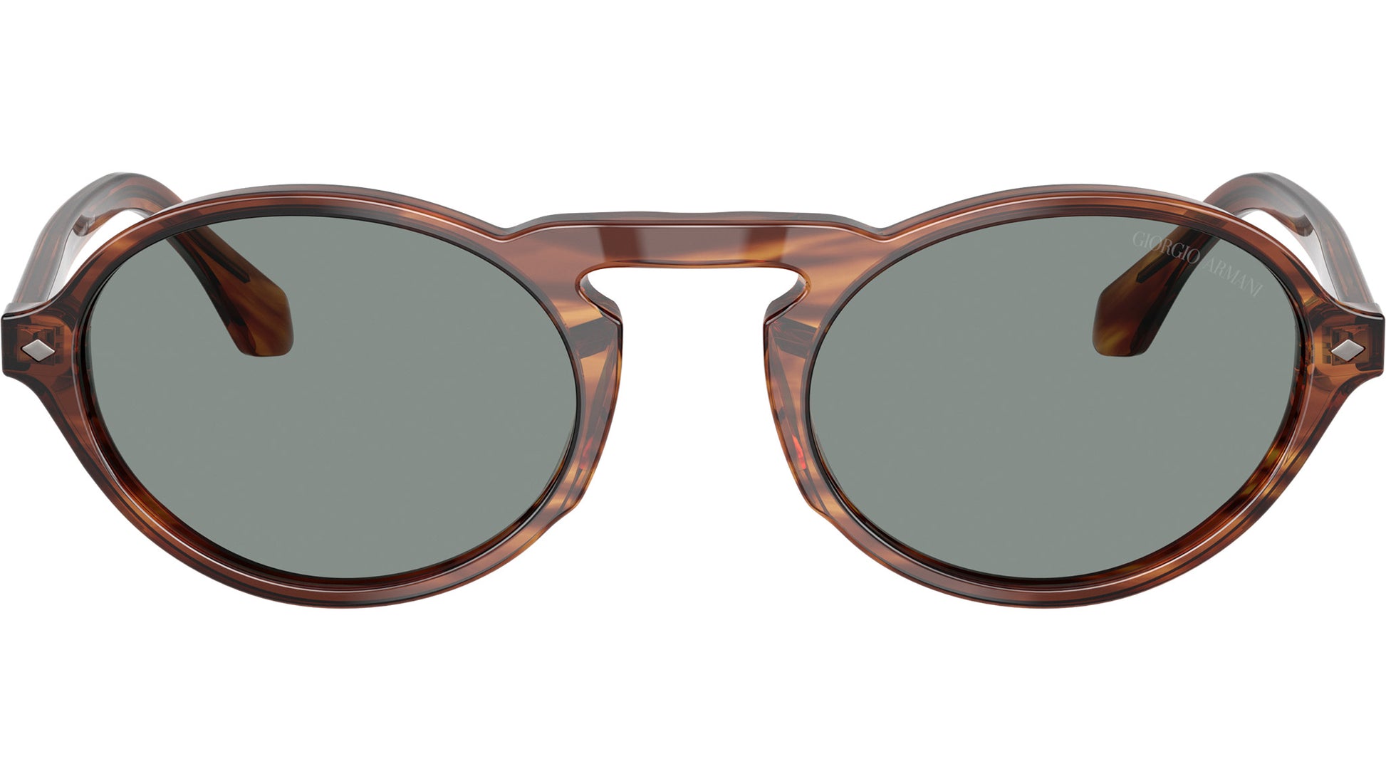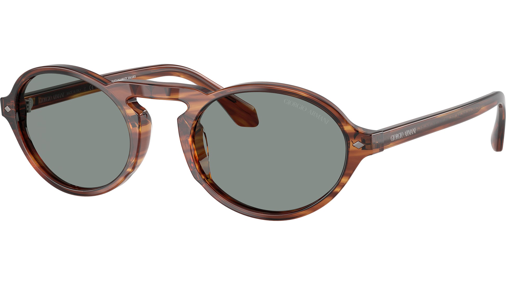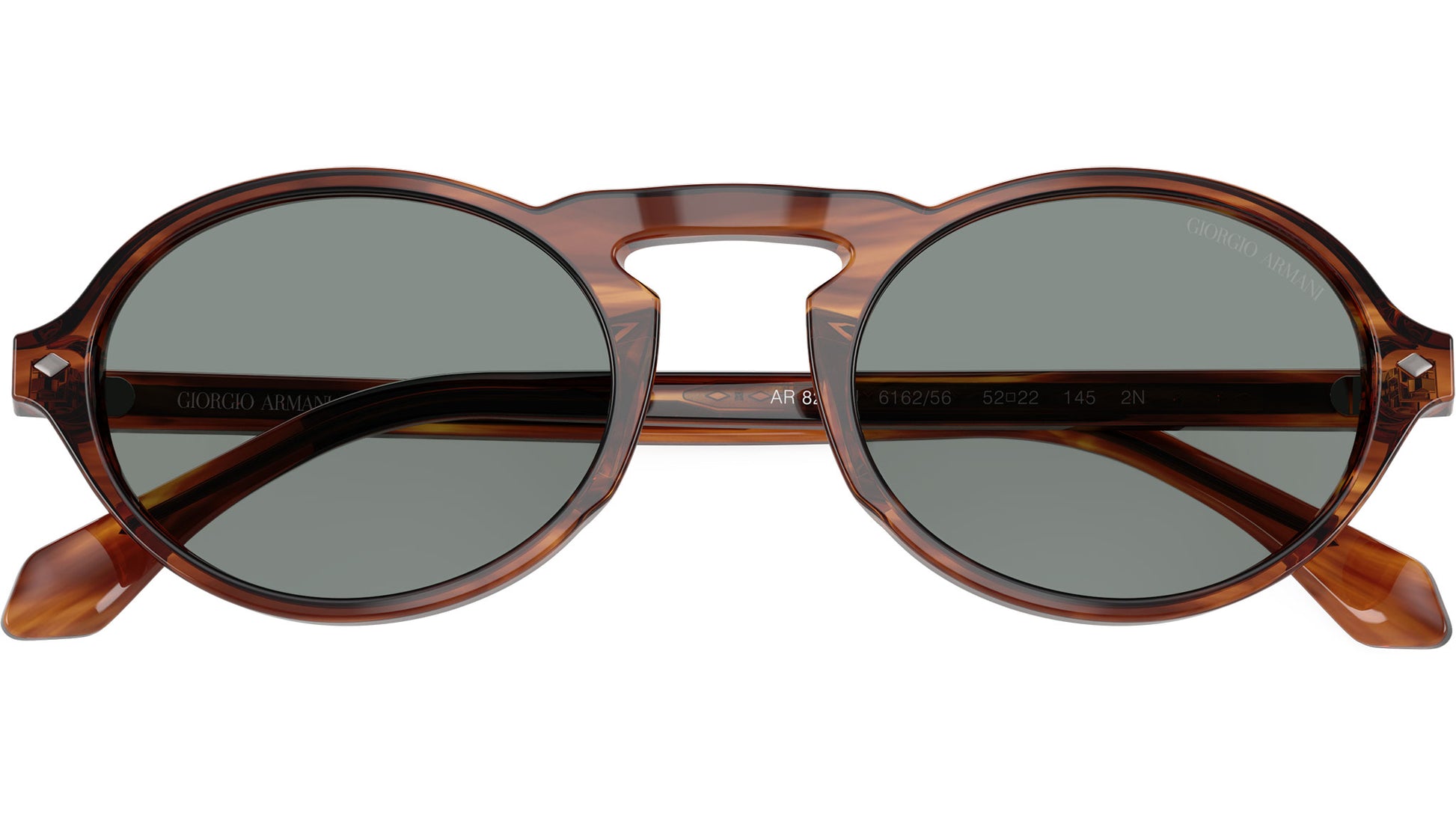 Giorgio Armani AR 8219U 616256 sunglasses, featuring striped brown oval acetate frame and blue glass lenses. Universal fit. Brand line: Armani Code. Style code: 0AR8219U. Color code: 616256. Authorized Giorgio Armani online reseller. Your glasses will include the original case and accessories and are covered by a 12-month global warranty.