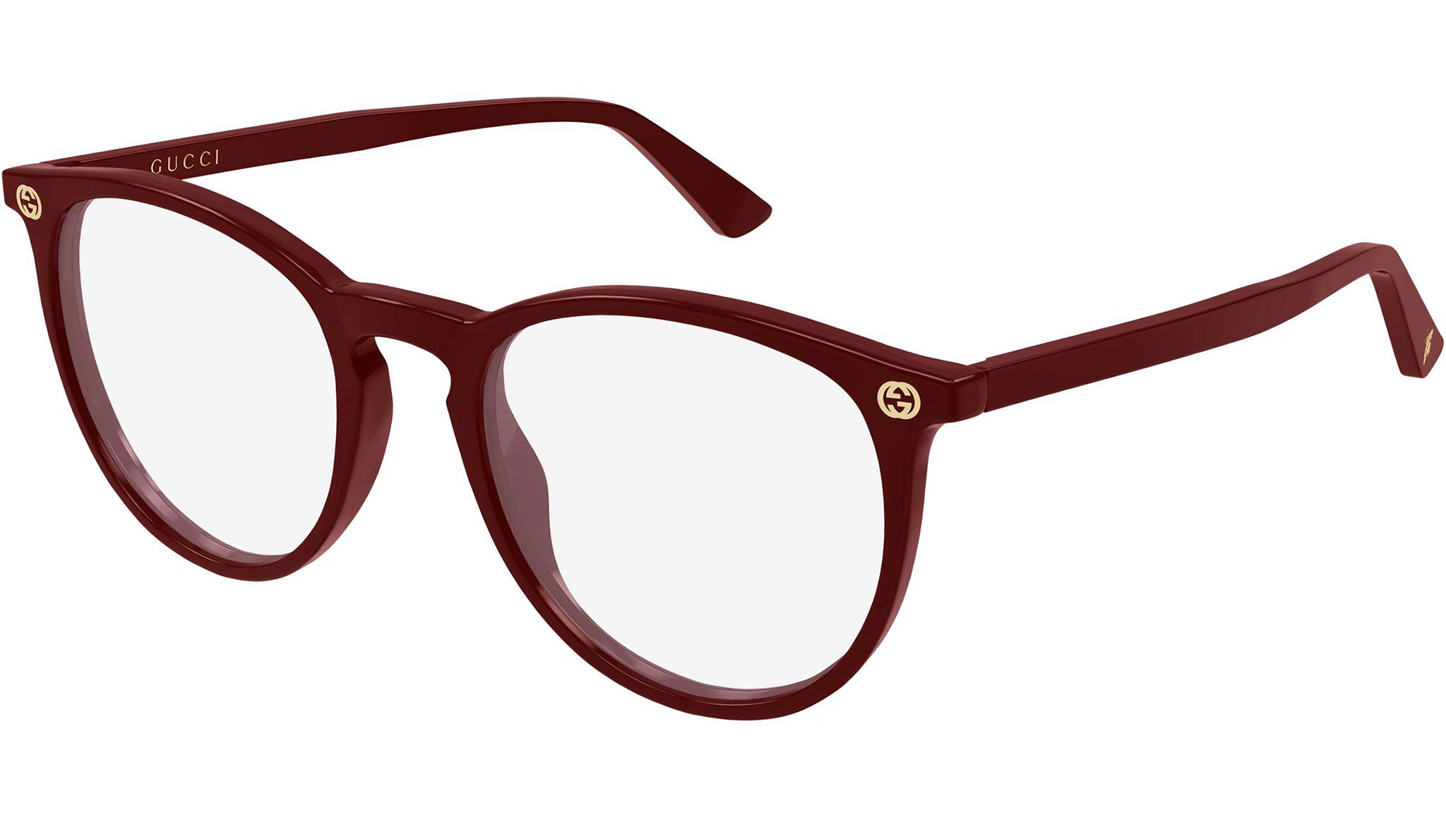Gucci GG0027O 021 glasses for women, featuring shiny solid burgundy panthos acetate frame and demo lenses. Brand line: Emblem. Style code: GG0027O. Color code: 021. Made in Italy. Authorized Gucci online reseller. Your glasses will include the original case and accessories and are covered by a 12-month global warranty.