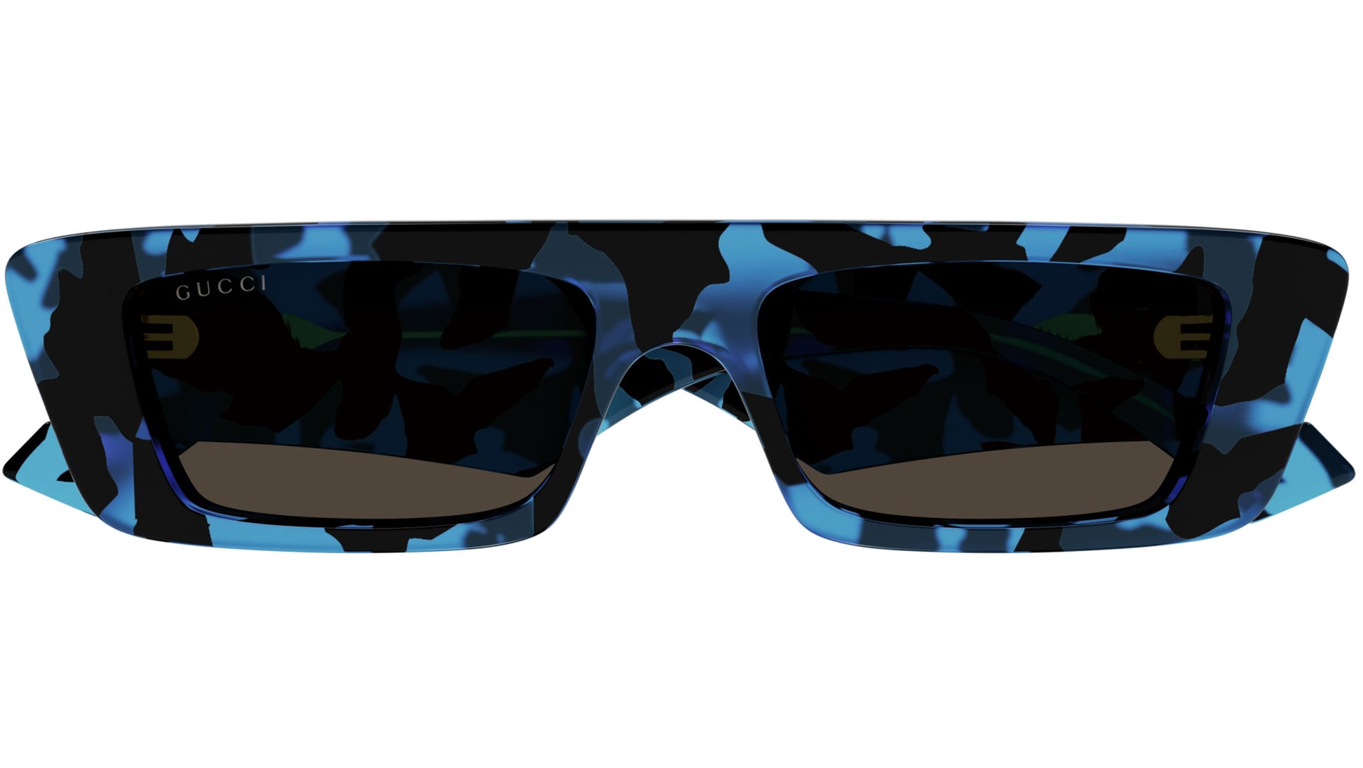 Gucci Lettering sunglasses model GG1331S rectangle recycled acetate frame color code 004 shiny spotted black turquoise havana with havana temple and solid dark brown lens.