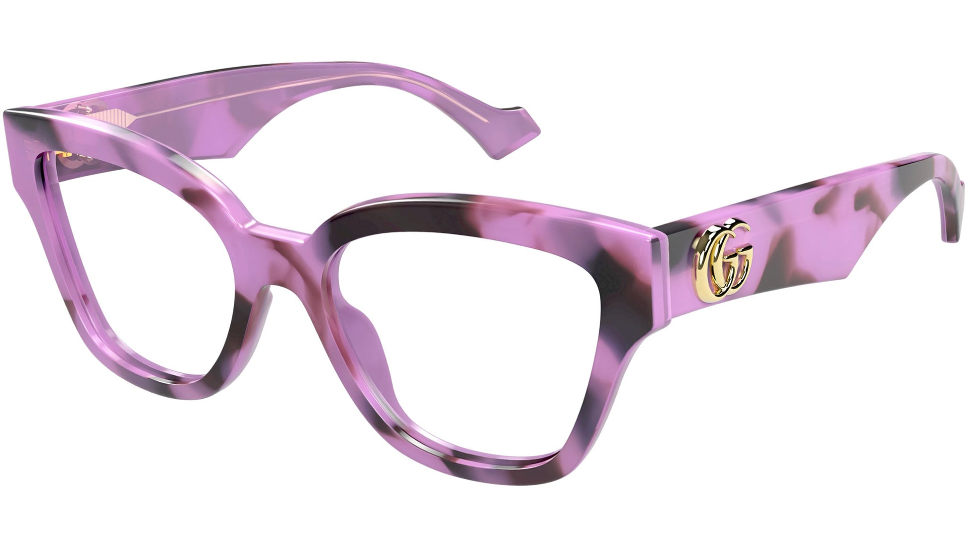 Gucci eyewear model GG1424O GG Logo line panthos recycled acetate frame in shiny opal liliac and black havana with violet temple and demo lens. Authorized Gucci online reseller. Your glasses will come with the original case and accessories and will be covered by a 12-month global warranty.