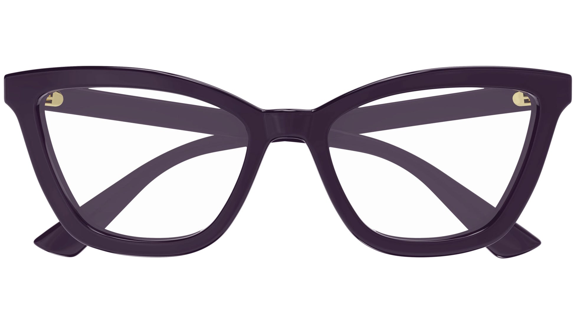 Gucci GG1686O 011 glasses for women, featuring shiny transparent dark purple panthos recycled acetate frame and demo lenses. Brand line: GG Logo. Style code: GG1686O. Color code: 011. Made in Italy. Authorized Gucci online reseller. Your glasses will include the original case and accessories and are covered by a 12-month global warranty.