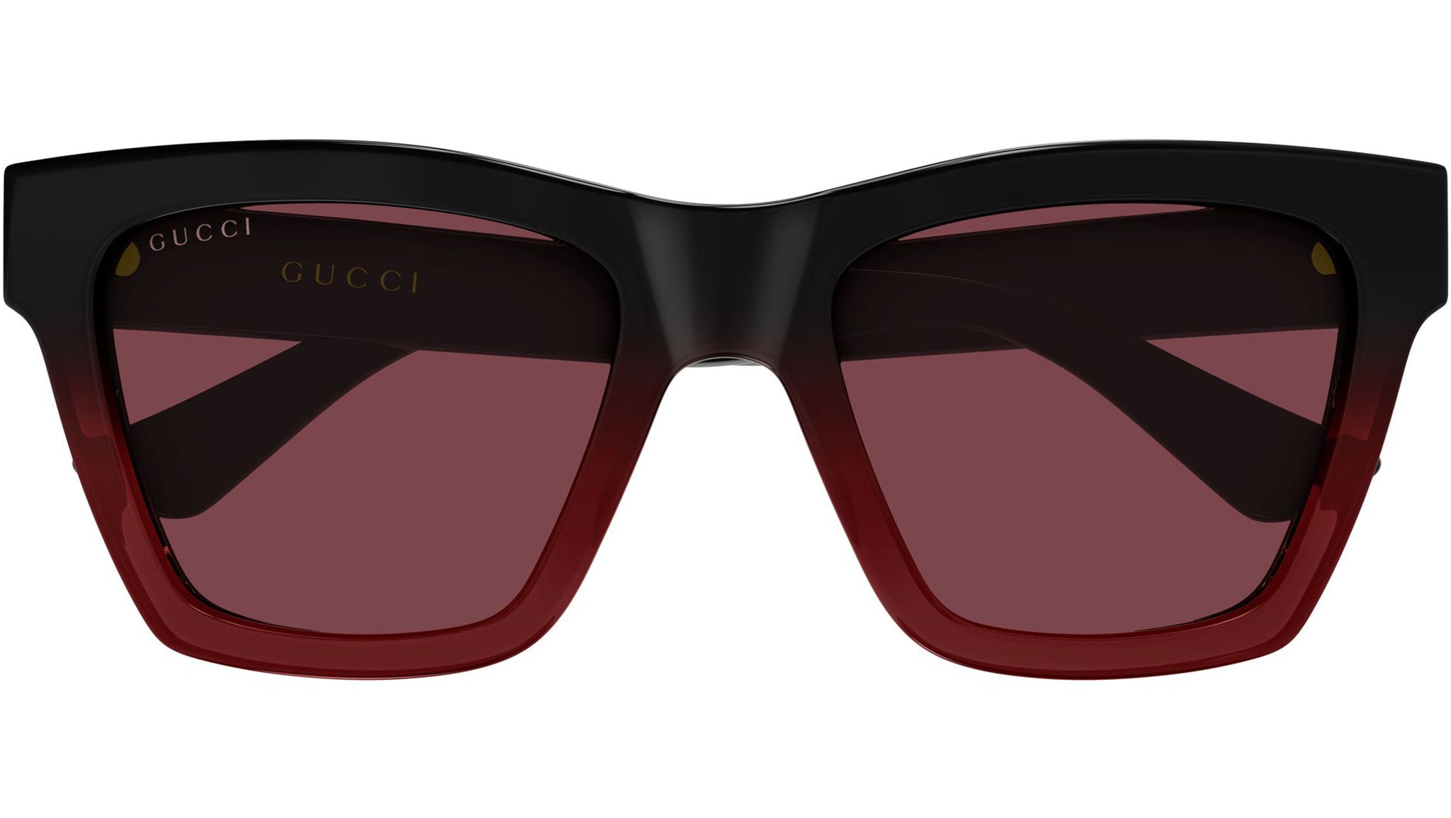 Gucci GG1714S 009 sunglasses for women, featuring shiny gradient from solid black to transparent red cat eye injection frame and solid burgundy bio nylon lenses. Brand line: Emblem. Style code: GG1714S. Color code: 009. Made in Italy. Authorized Gucci online reseller. Your glasses will include the original case and accessories and are covered by a 12-month global warranty.