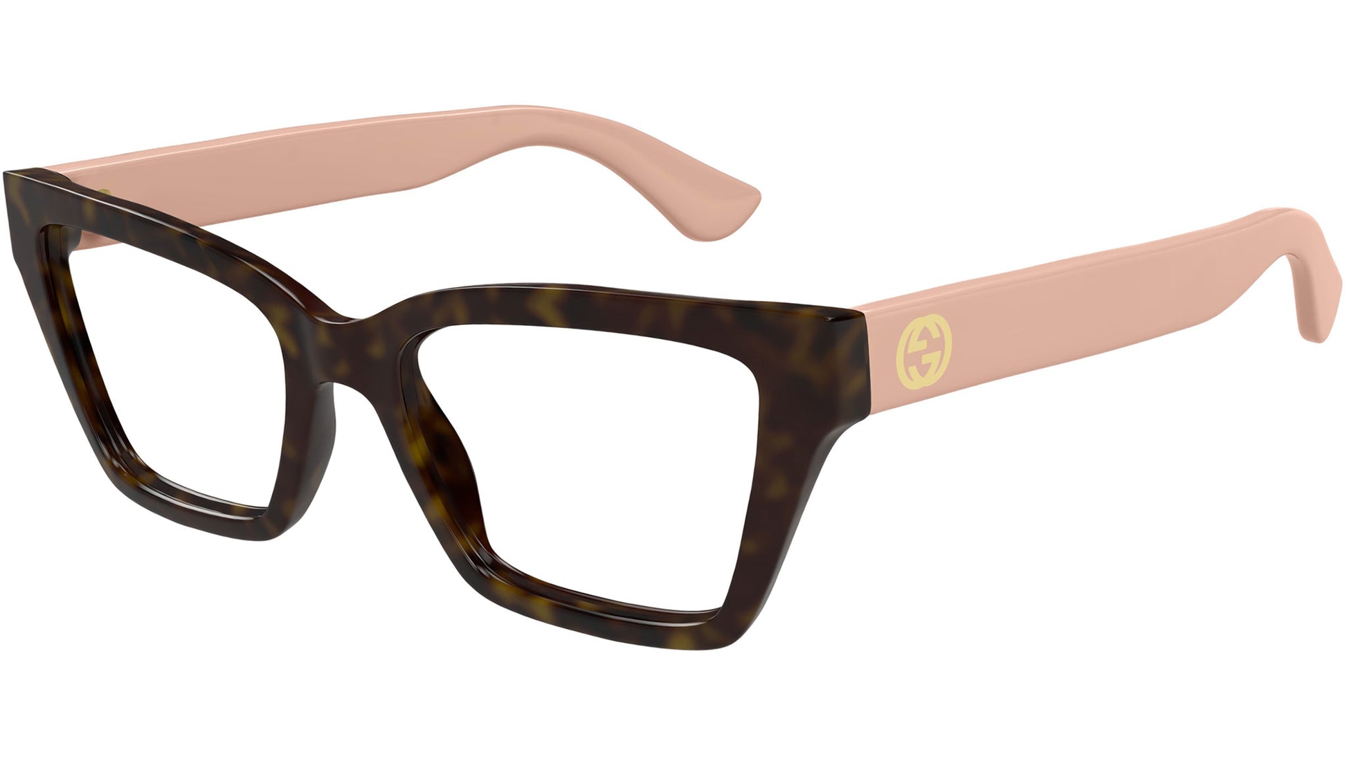Gucci eyewear model GG1715O GG Logo line cat eye injection frame color code 005 shiny dark havana with pink temple and demo lens. Authorized Gucci online reseller. Your glasses will come with the original case and accessories and will be covered by a 12-month global warranty.