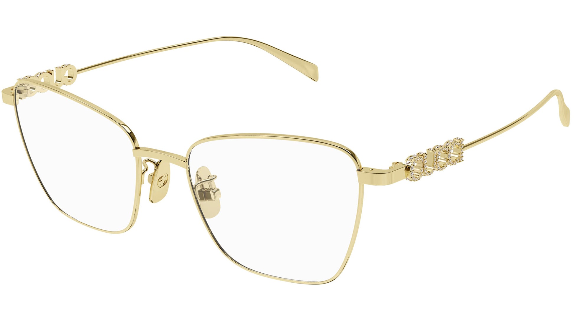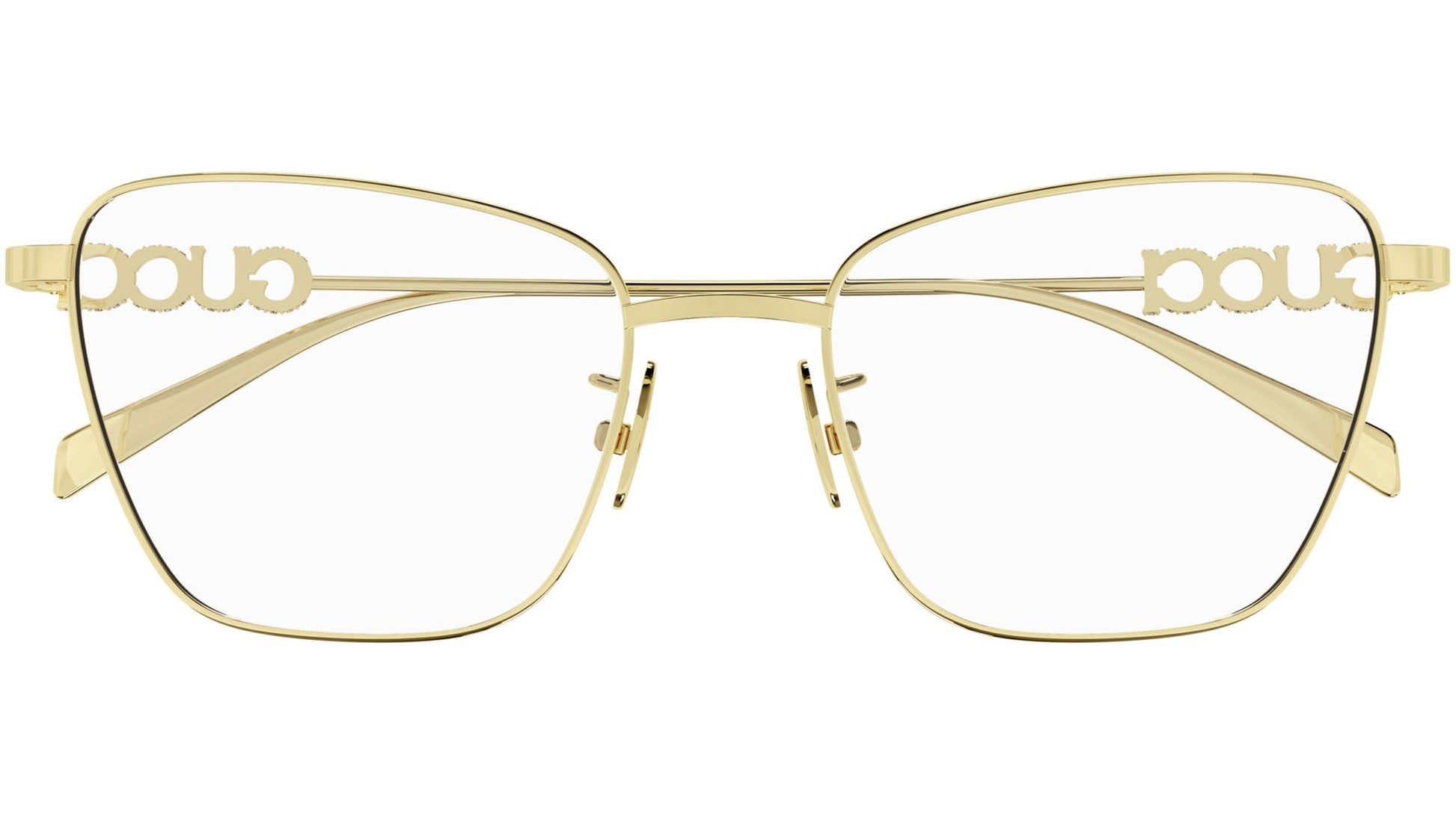 Gucci GG1807O 001 glasses for women, featuring shiny yellow gold butterfly metal frame and demo lenses. Brand line: Lettering. Style code: GG1807O. Color code: 001. Made in Japan. Authorized Gucci online reseller. Your glasses will include the original case and accessories and are covered by a 12-month global warranty.