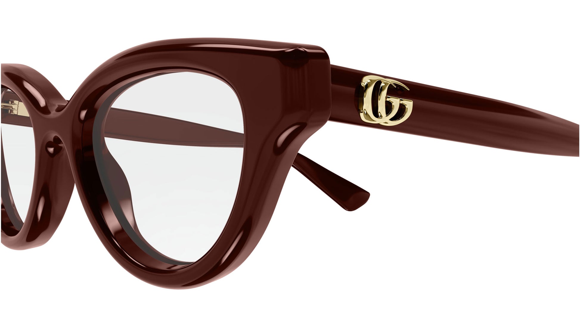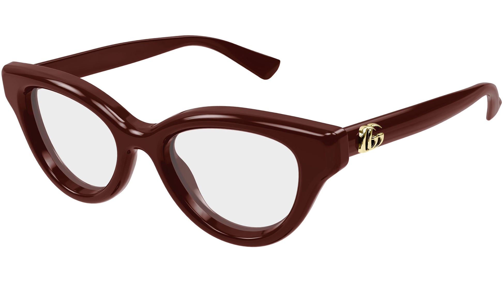Gucci GG1832O 003 glasses for women, featuring shiny solid burgundy cat eye injection frame and demo lenses. Brand line: GG Logo. Style code: GG1832O. Color code: 003. Made in Italy. Authorized Gucci online reseller. Your glasses will include the original case and accessories and are covered by a 12-month global warranty.
