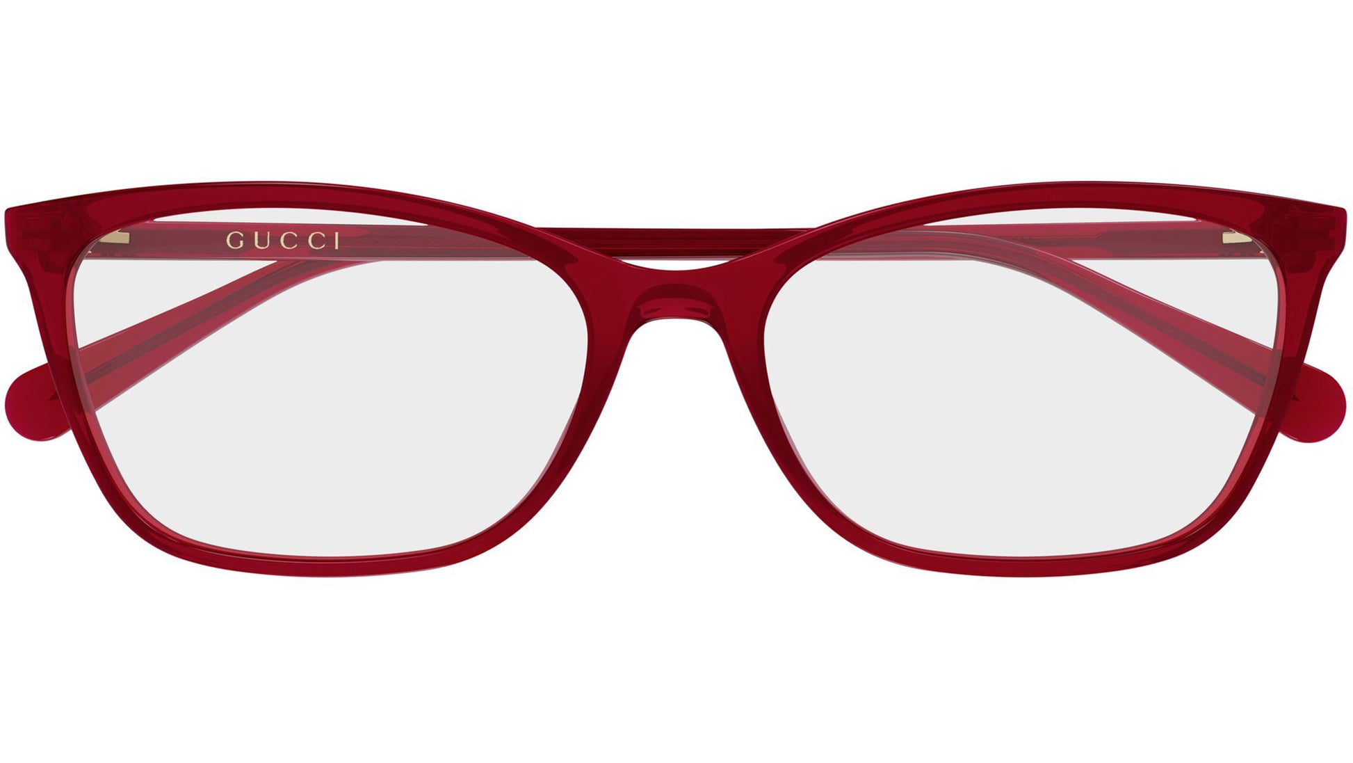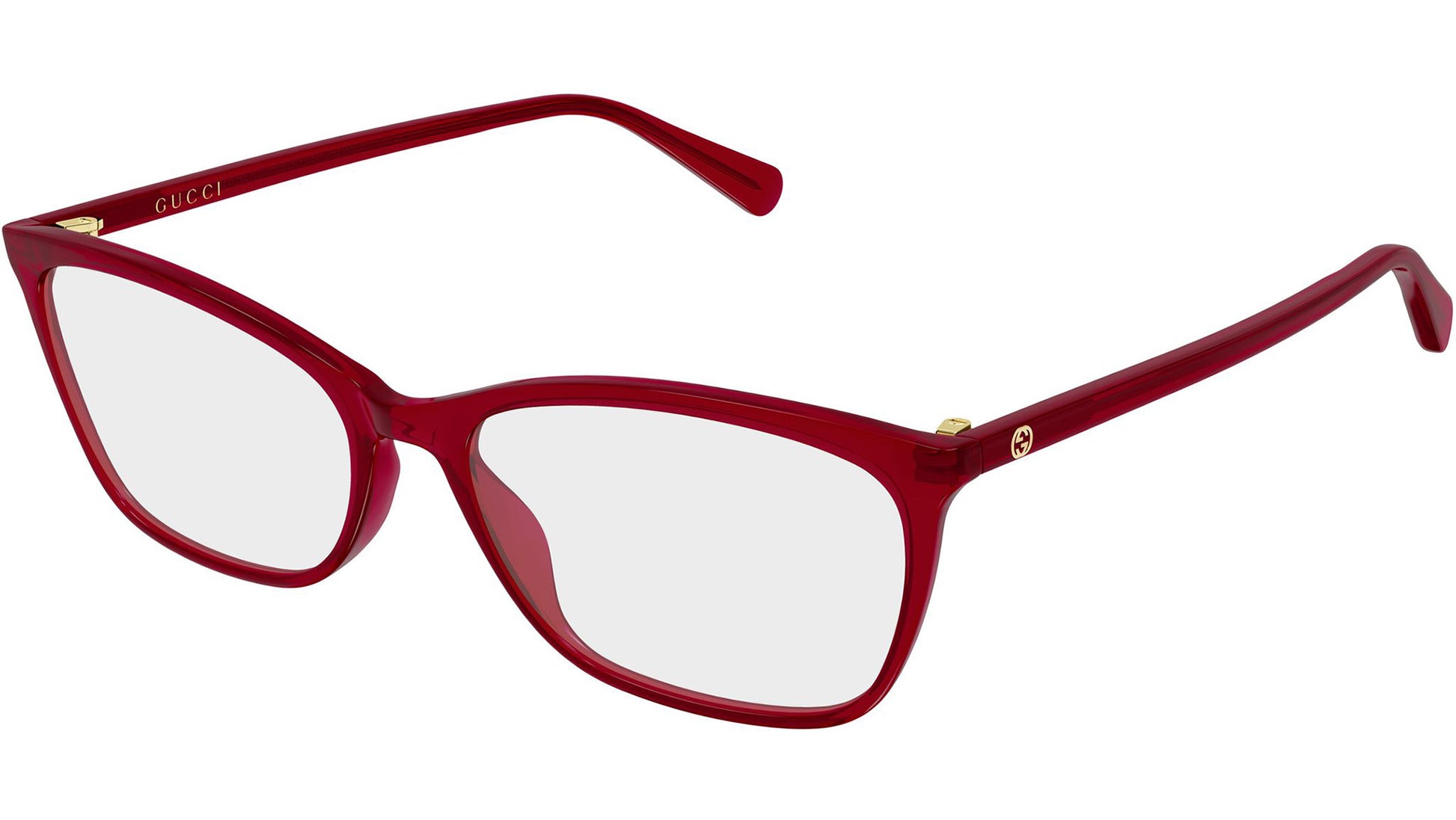 Gucci GG1930O glasses for women, featuring shiny transparent red rectangular recycled acetate frame and demo lenses. Brand line: Emblem. Style code: GG1930O. Color code: size 57: 009. Size 50: 005. Made in Italy. Authorized Gucci online reseller. Your glasses will include the original case and accessories and are covered by a 12-month global warranty.