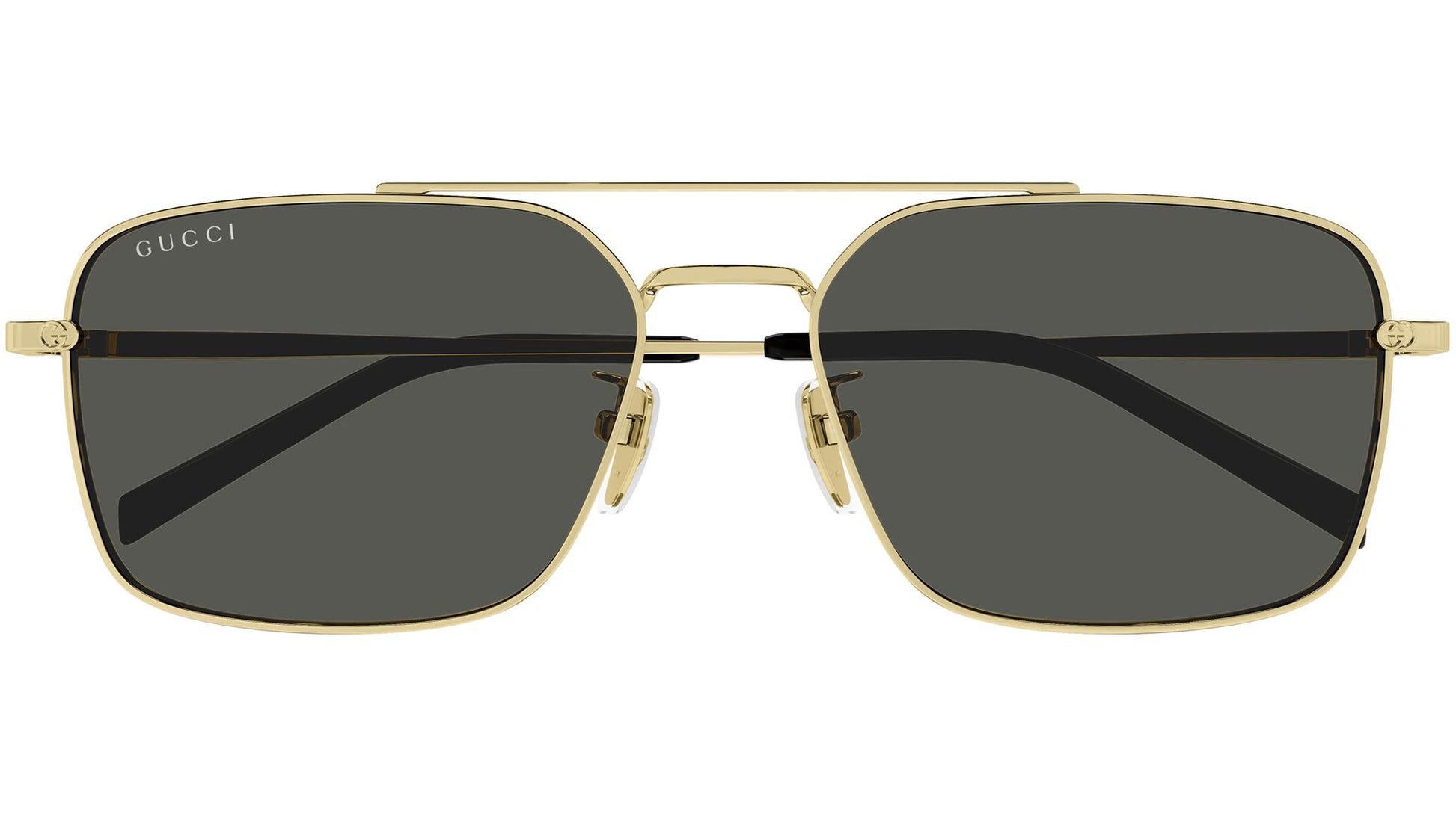 Gucci GG1957SA 001 sunglasses for men, featuring shiny endura gold rectangular metal frame and solid grey bio nylon lenses. Brand line: Institutional Logo. Style code: GG1957SA. Color code: 001. Made in Japan. Authorized Gucci online reseller. Your glasses will include the original case and accessories and are covered by a 12-month global warranty.