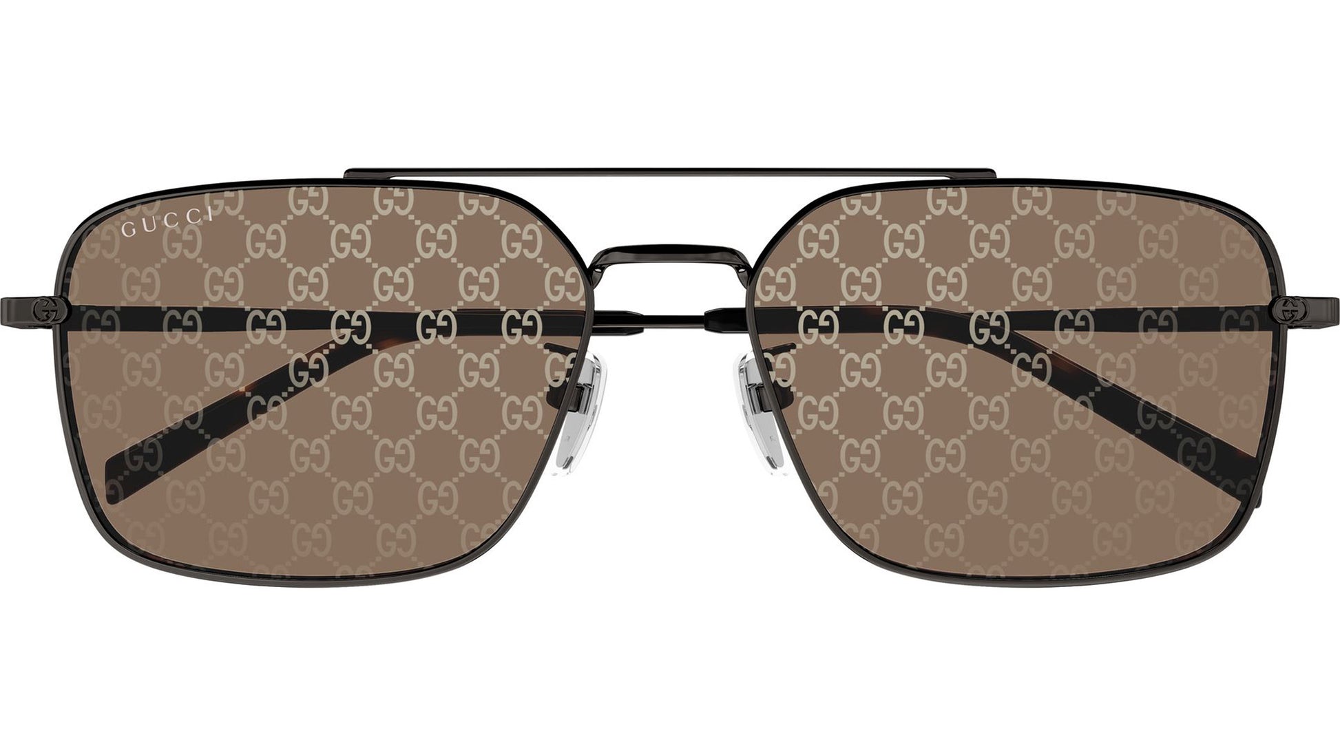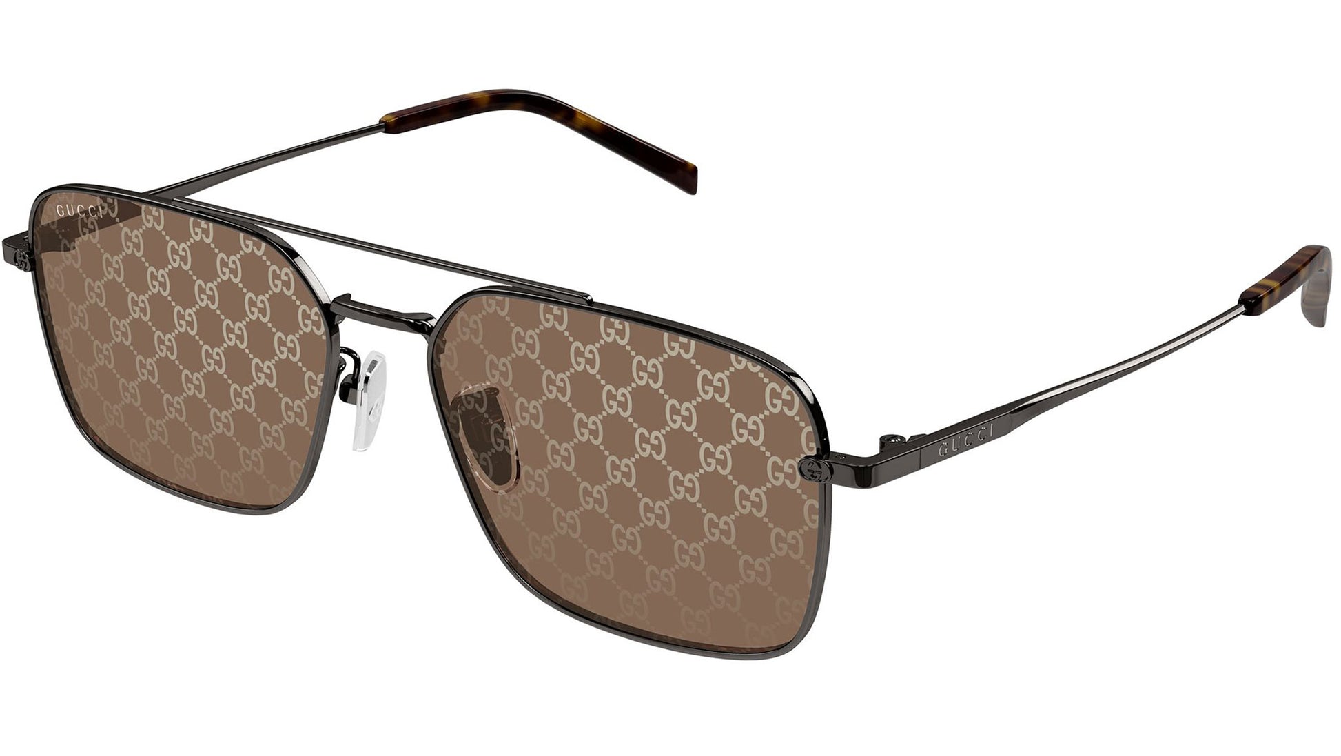 Gucci GG1957SA 005 sunglasses for men, featuring shiny gun metal rectangular metal frame and solid brown + white mini classic guccissima logo specchiato bio nylon lenses. Brand line: Institutional Logo. Style code: GG1957SA. Color code: 005. Made in Japan. Authorized Gucci online reseller. Your glasses will include the original case and accessories and are covered by a 12-month global warranty.